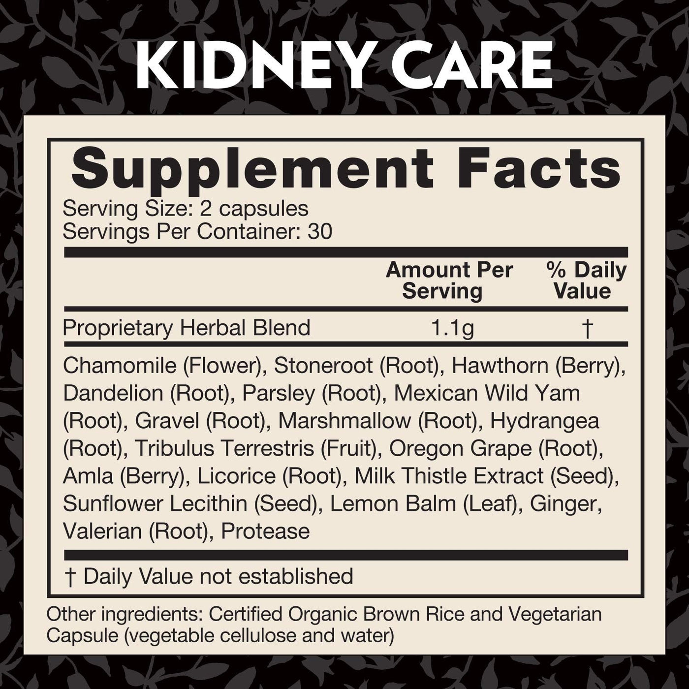 - All-Natural Ingredients: Kidney Cares 17 herbal ingredients include diuretic herbs (stone root & gravel root) that flush the kidneys and well as herbs that relieve discomfort by addressing inflammation (chamomile, valerian and marshmallow roots).