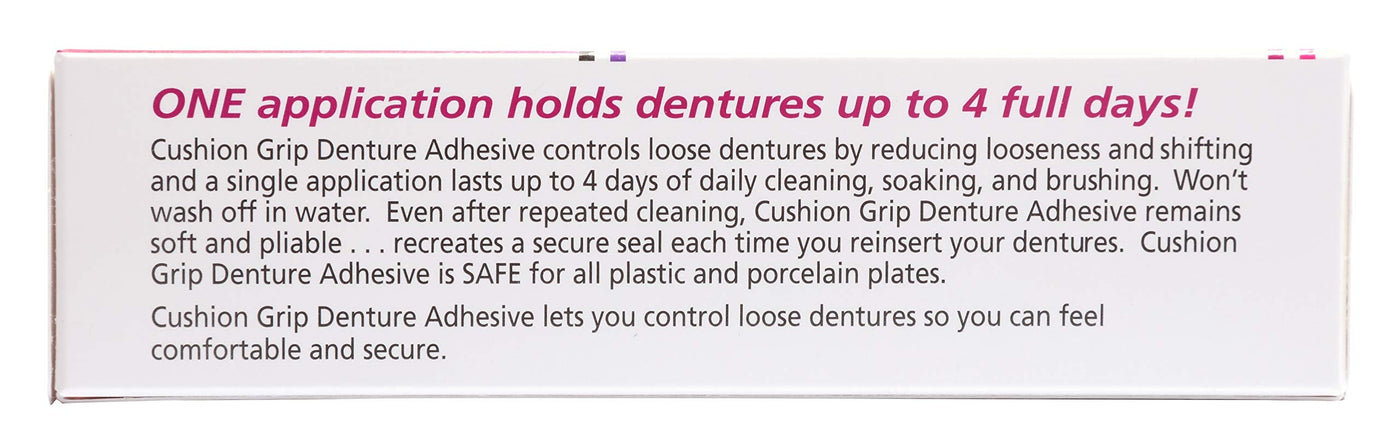 Experience the original and best thermoplastic dental adhesive for your dentures. Great to secure upper and lower plates, and partials. Cushion Grip’s exclusive thermoplastic polymer formula gives denture wearers a long lasting, comfortable, secure hold for up to 4 days with a single application. 100% waterproof Cushion Grip will not wash off or breakdown in water like ordinary dental cream/paste adhesives. Even after daily cleaning, soaking and brushing, professional strength Cushion Grip recreates a secure seal each time you reinsert your dentures lasting 4 times longer than ordinary dental adhesives. Makes eating easier and more comfortable. Experience the best in denture comfort, experience Cushion Grip. How does Cushion Grip work? Cushion Grip acts like both an adhesive and a soft reliner. It is not a “glue”. Cushion Grip adheres to your dentures and molds to the shape of your gums. It creates the suction needed to keep your dentures in place without a glue. The product is recommended to be used without additional adhesives or reliners with great results; however, some customers prefer to use Cushion Grip with other products for extra security. Please see easy How to Apply and Remove Videos and Instructions for Use on the MyCushionGrip website. Helpful tips for application and removal: · Ensure tube is placed in hot water upside down with cap tightly closed to facilitate easy removal from the tube. At room temperature, Cushion Grip is a highly viscous semi-solid material which becomes pliable with heat. · Dentures should be completely dry before application of Cushion Grip. · For a first-time user, please start with a small amount. Use more, if needed, until you determine the right amount for your dentures. · Please consult dentist if you have to apply denture adhesive more than once a day. · To remove, place denture in hot water for 10 minutes allowing Cushion Grip to be easily peeled off like a liner. Frequently Asked Question: Is this the same Cushion Grip Thermoplastic Denture Adhesive that was originally sold by Schering Plough and Merck? Yes! Cushion Grip is back by popular demand! USpharma has relaunched the exact same original thermoplastic formula that Cushion Grip users loved and depended on to secure their dentures since 1950. When purchasing, look for the Cushion Grip logo with original formula on the package. Be wary of imitation brands claiming they are a Cushion Grip replacement. Made in the U.S.A. of U.S. and/or Imported Ingredients. You Spoke. We Listened. A passionate and loyal fan base kept the Cushion Grip product alive via social media and blogs. YouTubers made videos pleading for the return of Cushion Grip to mass merchandisers and drug store retailers, which lead to a petition being launched on Change.org to bring the product back Read more Nothing beats the Original Formula. Since first being introduced in 1950, Cushion Grip was consistently a favorite consumer product for denture wearers due to its long lasting 4-day secure hold, and cushioned softness. Read more Smile with Your Friends Again! Cushion Grip is zinc-free, and non-toxic. Cheers to Your Smile! Read more The Couple that Smiles Together, Stays Together. With just one smile You can make a Person's Day. That person might even be You. Cushion Grip is back to see you smile again! Read more