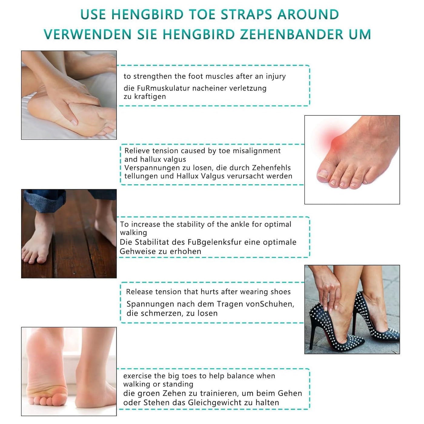 - Excellent resultsHallux Valgus Training Band delivers amazing results for your toe misalignments. It helps realign and relax your big toes and allows to improve toe flexibility, reduce tension between toes and relieve pain. These resistance bands gently and quickly reduce the tired and tense feeling in the toes caused by bunions, hammertoes, hallux valgus, etc.