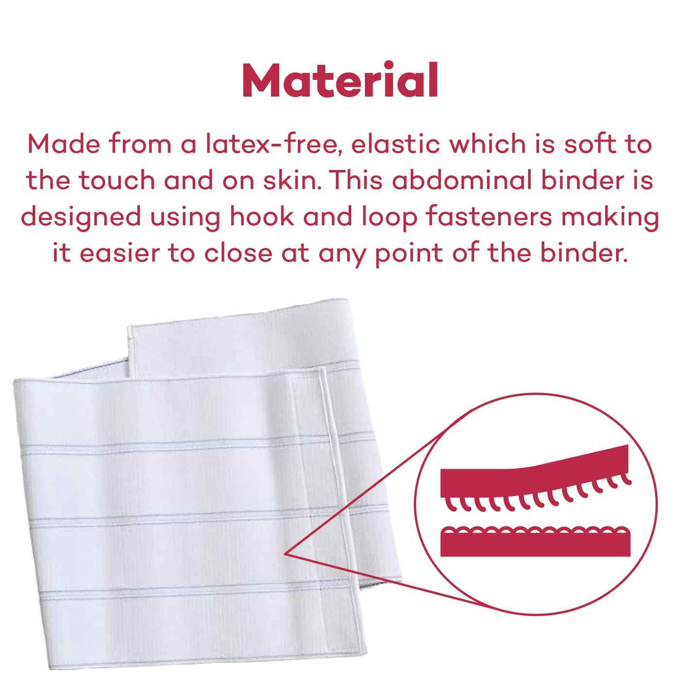 - Optimal Comfort The latex- free, high-quality plush elastic is soft on the skin allowing for optimal comfort. It also permits a closure at any point on the circumference of the binder.