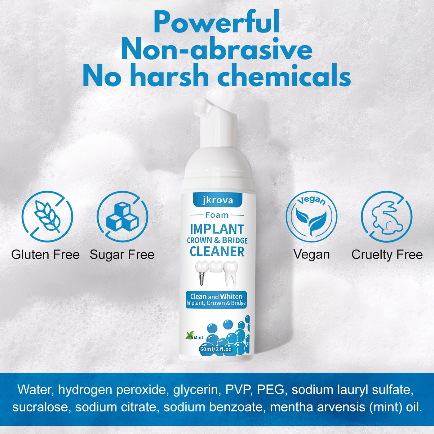 - Non-abrasive & Safe: Our professional foaming cleaner is gentle and non-abrasive, making it safe for all implants, crowns, and bridges. Unlike harsh pastes, floss, and mouthwash, the fine foam cleans and whitens without damaging dental workkeeping your smile healthy, bright, and protected