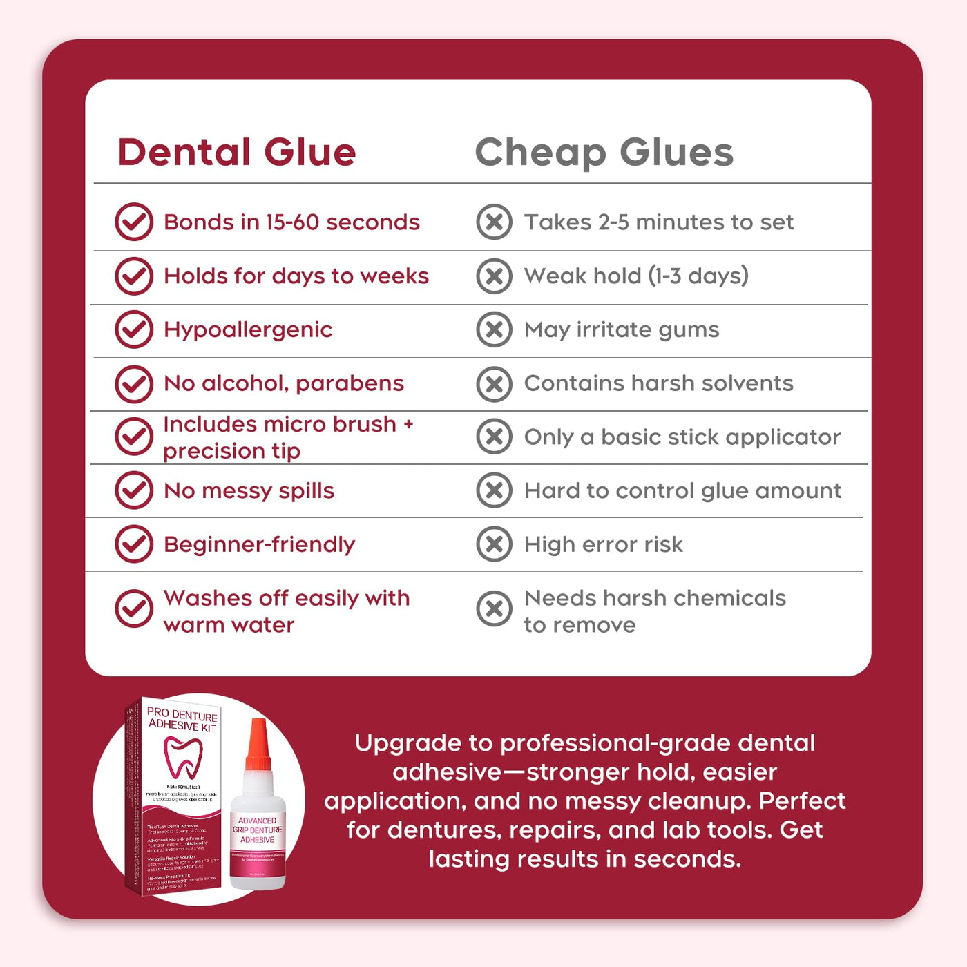 - Safe and Convenient: Hypoallergenic formula: Free from common irritants (e.g., parabens, alcohol) Ready-to-use: No mixing or heating required Easy residue removal: Cured adhesive can be easily cleaned with warm water without damaging denture surfaces