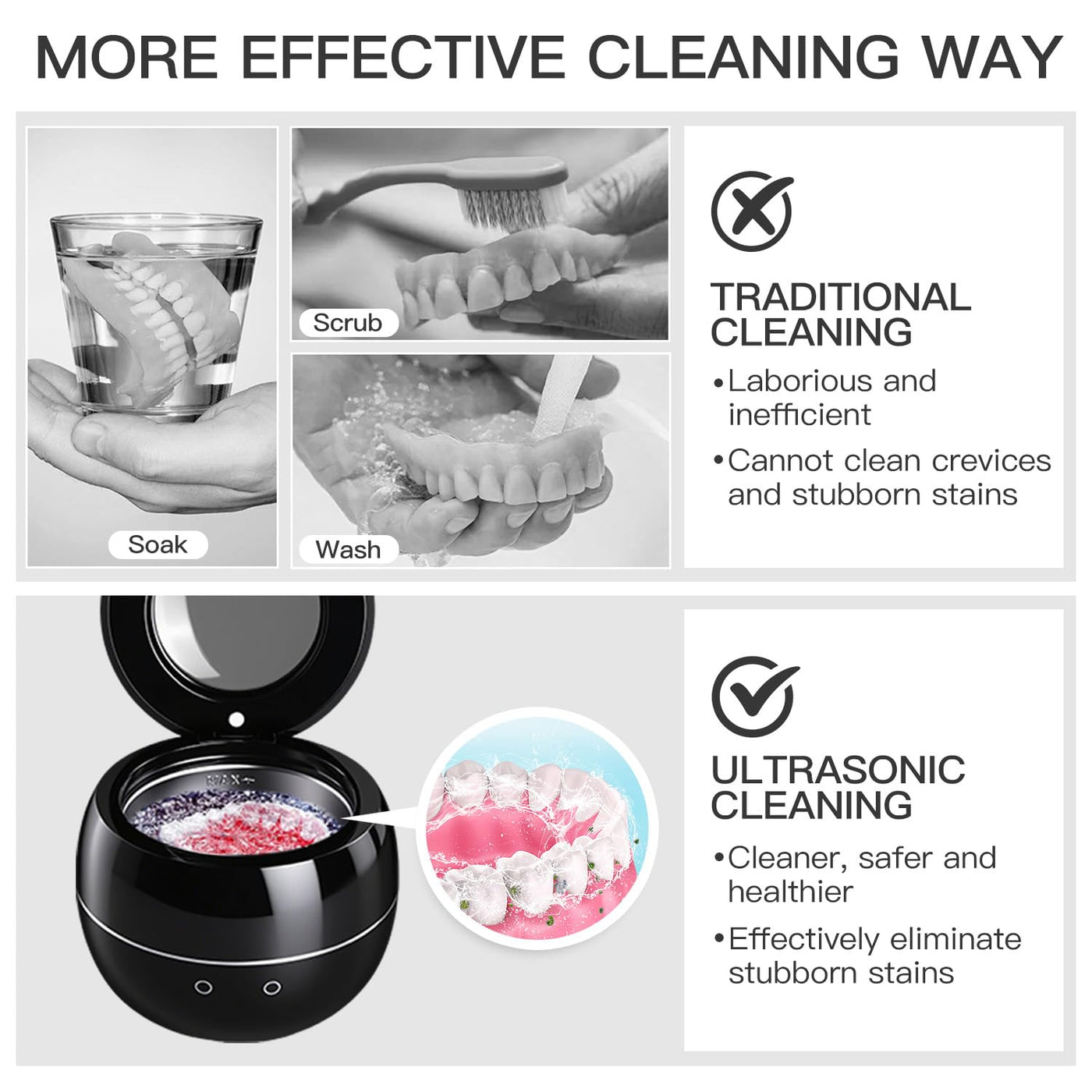 - Large capacity & low noise: This dental cleaning pod cleaner features a large 250ml stainless steel cylinder that easily accommodates retainers, mouthguards, dentures, and even jewelry of all sizes. Its compact size makes it portable and perfect for travel. The Ultrasonic Jewelry Cleaner operates at less than 45dB, providing a quiet cleaning experience. The electrical hum generated by ultrasonic vibrations is normal.