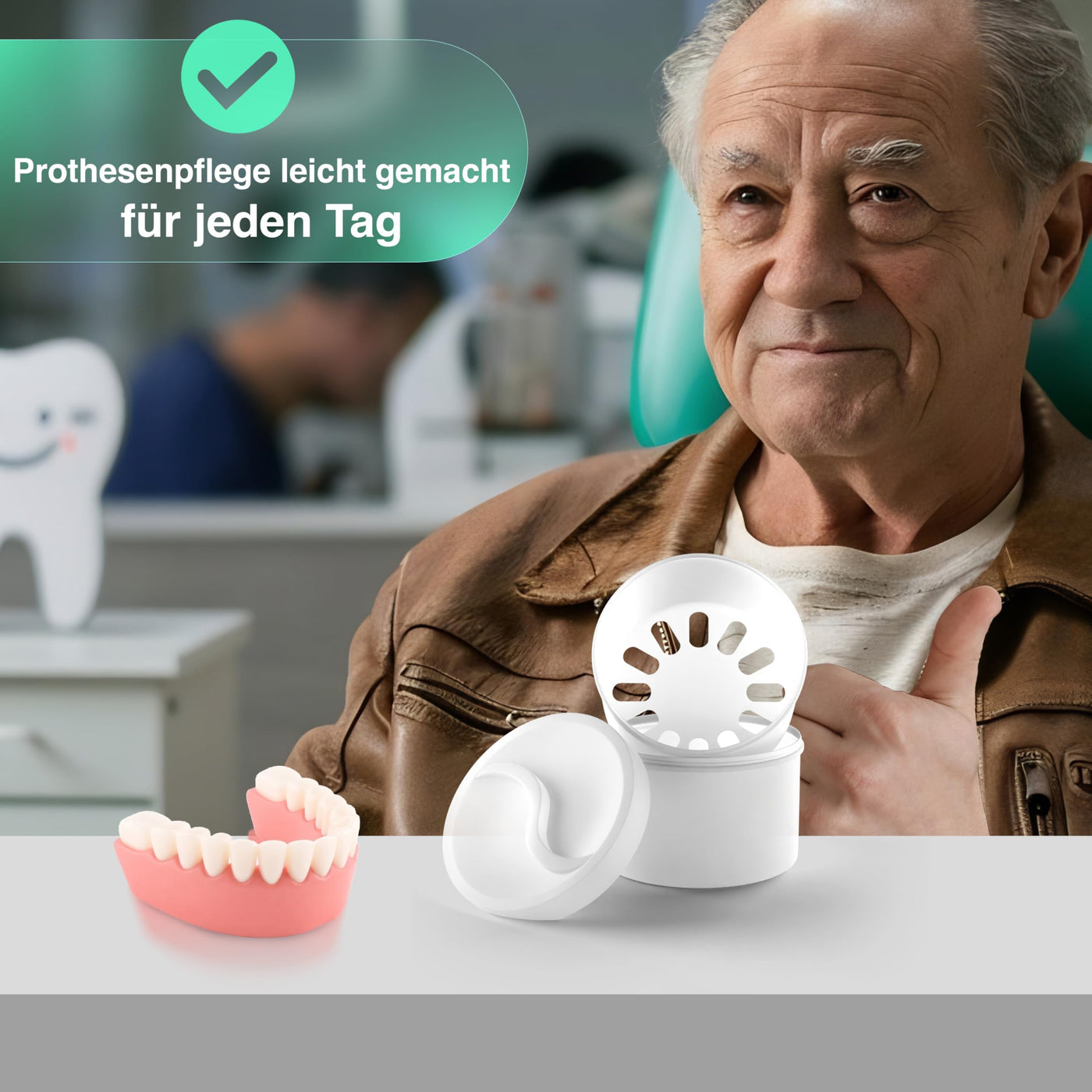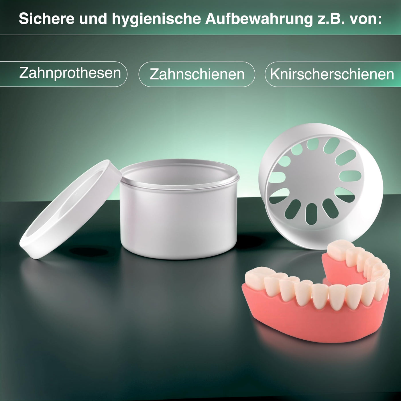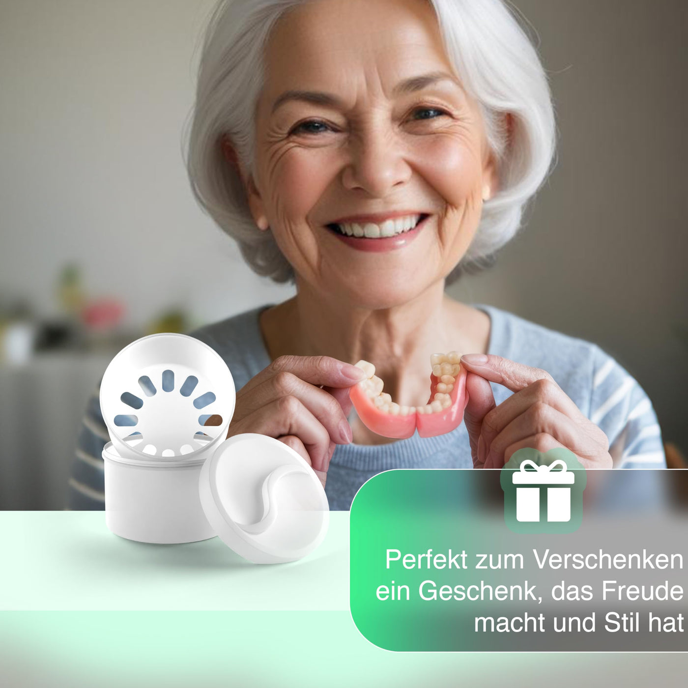 - Versatile use and stylish design The denture holder is suitable not only for dentures, but also for dental splints, retainers and mouth guards. Its compact shape and timeless design fit perfectly in the bathroom, in your travel luggage or in camping accessories.