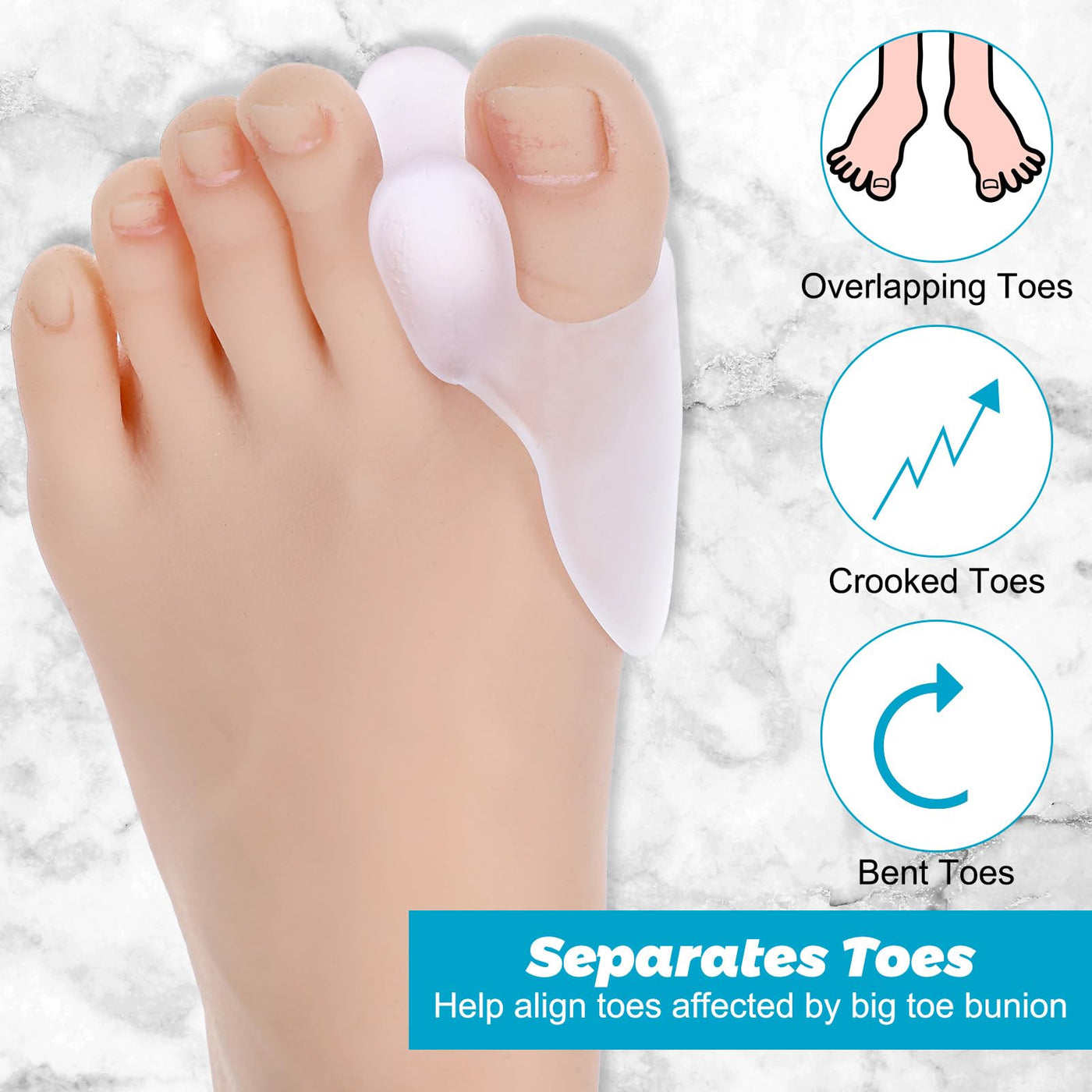 - Reusable and skin-friendly materialMade from soft, durable and flexible SEBS material, our Hallux Valgus pad is odorless and gentle on the skin. These toe protectors for men and women are washable and reusable, ensuring long-term use without irritation. The universal size makes them suitable for both men and women and offers toe pads for pain relief.