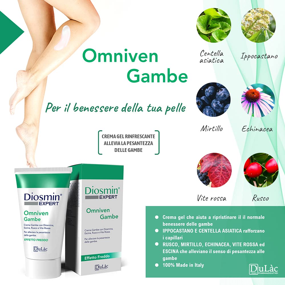 Read more DULÀC PHARMA Our company develops natural products made in Italy of the highest quality, thanks to a careful choice of raw materials (often organic) and innovative techniques such as ultrasound extraction, which keeps intact the active ingredients of plants. We follow strict standards to ensure the maximum effectiveness of our products, specially made for the well being of the people. Omniven Gambe Leg Cream Dulàc Cold-effect Leg cream specially formulated to give relief to heavy and tired legs If you spend many hours in a static position, standing or sitting, at the end of the day you are sure to have a big problem: swollen, heavy legs. At last you've found the right thing for you: Omniven Legs, our leg cream specially formulated for those who suffer from heavy, swollen and tired legs. Apply it before bed or as needed. You will immediately feel your legs lighter, thanks to the active ingredients contained in the cream, which improve circulation and provide freshness! Improves leg circulation Helps you have light and relaxed legs Has a cooling effect to relieve heaviness Can help strengthen fragile capillaries, reducing the risk of spider veins on the legs With Diosmin, Horse Chestnut, Butcher's Broom and many other active ingredients beneficial for circulation Read more Relaxing cream for legs, ankles and feet The feeling of heaviness in the legs is typical for people who perform sedentary tasks, whether standing or sitting. It occurs mostly in the evening and at night, when your legs should be resting but swelling prevents it. If you suffer from this problem, you absolutely must relieve your poor legs! Our Omniven Legs cream is just the thing for you if you need a feeling of lightness and freshness. The formulation rich in flavonoids and menthol is specially designed to have a relieving effect. Reduces the occurrence of broken capillaries Ruptured capillaries on the legs (called spider veins and often associated with varicose veins) are mainly the result of circulation problems and work that requires standing for many hours a day. The active ingredients of our leg cream, and the upward massage recommended for its application, can improve circulation and strengthen fragile capillaries. If you are fed up with these problems, we also recommend another product: Omniven 500, our circulation-enhancing supplement! For swollen legs, ankles and feet At the end of the day, especially if you often stand or sit, you always have a nasty surprise: swollen legs, ankles and feet. The active ingredients of our leg cream and the massage to apply it help to relax and deflate the affected area. In addition, the menthol it contains gives a pleasant feeling of freshness, ideal for your tired legs. Our cream will become one of your best allies for resting at its best! Support for leg circulation Diosmin, contained in our leg cream, has anti-varicose properties. Escin, in topical application, is used against haematoma and chronic venous insufficiency. All the other active ingredients in Omniven Legs (Diosmin, Escin, Butcher's Broom, Red Vine, Horse Chestnut, Centella Asiatica, Bilberry, Echinacea) also improve blood circulation. In addition, menthol increases blood flow in the skin microvasculature and refreshes the treated area. Read more Omniven Leg Cream Omniven 500 microcirculation supplement Procto Complex Haemorrhoid cream Format 150 ml 40 tablets/120 tablets 40 g Description Natural leg circulation cream to relieve heaviness and cramps Natural dietary supplement of flavonoids for improving blood circulation Natural ointment to relieve hemorrhoidal disorders Benefits Restless legs syndrome relief, cold effect, improves circulation Circulation and vein support, hemorrhoids relief, light and healthy legs Soothes and helps reduce itching and discomfort associated with hemorrhoidal disorders Active Ingredients Sweet Almond Dulcis Oil, Menthol, Sunflower Seed Oil, Diosmin, Horse Chestnut Seed Extract, Centella Asiatica Leaf Extract, Butcher's Broom Root Extract, Aescin, Grape Leaf Extract, Bilberry Extract, Echinacea Angustifolia Root Extract Diosmin, Hesperidin, Butcher's Broom Root Extract (Ruscus Aculeatus), Horse Chestnut Bark Extract (Aesculus Hippocastanum), Vitis Vinifera Seeds Extract (Vitis Vinifera) Shea Butter, Diosmin, Centella Asiatica Leaf Extract, Aloe Barbadensis Leaf, Sunflower Seed Oil Recommended way of use Apply one or more times daily, from the bottom up, until fully absorbed Up to two tablets per day, in cycles of two or three months Apply 2 or 3 times a day, if possible after each evacuation. Cover affected part Cruelty Free ✓ ✓ ✓ Natural formula ✓ ✓ ✓ Flavonoids action Flavonoids are particularly known for their antioxidant action and their activity in protecting and strengthening the microcirculation and capillaries, even when applied directly to the skin. If you suffer from swollen, tired and heavy legs, you'll be happy to know that our cream is rich in flavonoids such as Diosmin, Escin, Butcher's Broom, Red Vine, Horse Chestnut, Centella Asiatica, Bilberry, Echinacea and Menthol. In addition, if you have circulation problems, but also for your general well-being, it would be great if you incorporated flavonoid-rich foods (found in many fruits and vegetables) into your diet. Strengthening fragile capillaries Broken capillaries are the result of a problem affecting the peripheral circulatory system, mainly in the leg area. The fragility of these small blood vessels causes them to rupture very easily, resulting in a lack of blood flow to the surrounding area. If you also suffer from capillary fragility, the best solutions to solve your problem are three: eating foods rich in antioxidants, applying a leg cream rich in flavonoids, such as our Omniven Legs, and taking a supplement dedicated to improve circulation, such as Omniven 500. Our line is specially developed to help those who suffer from heavy legs, varicose veins and, indeed, fragile capillaries! Legs cir
