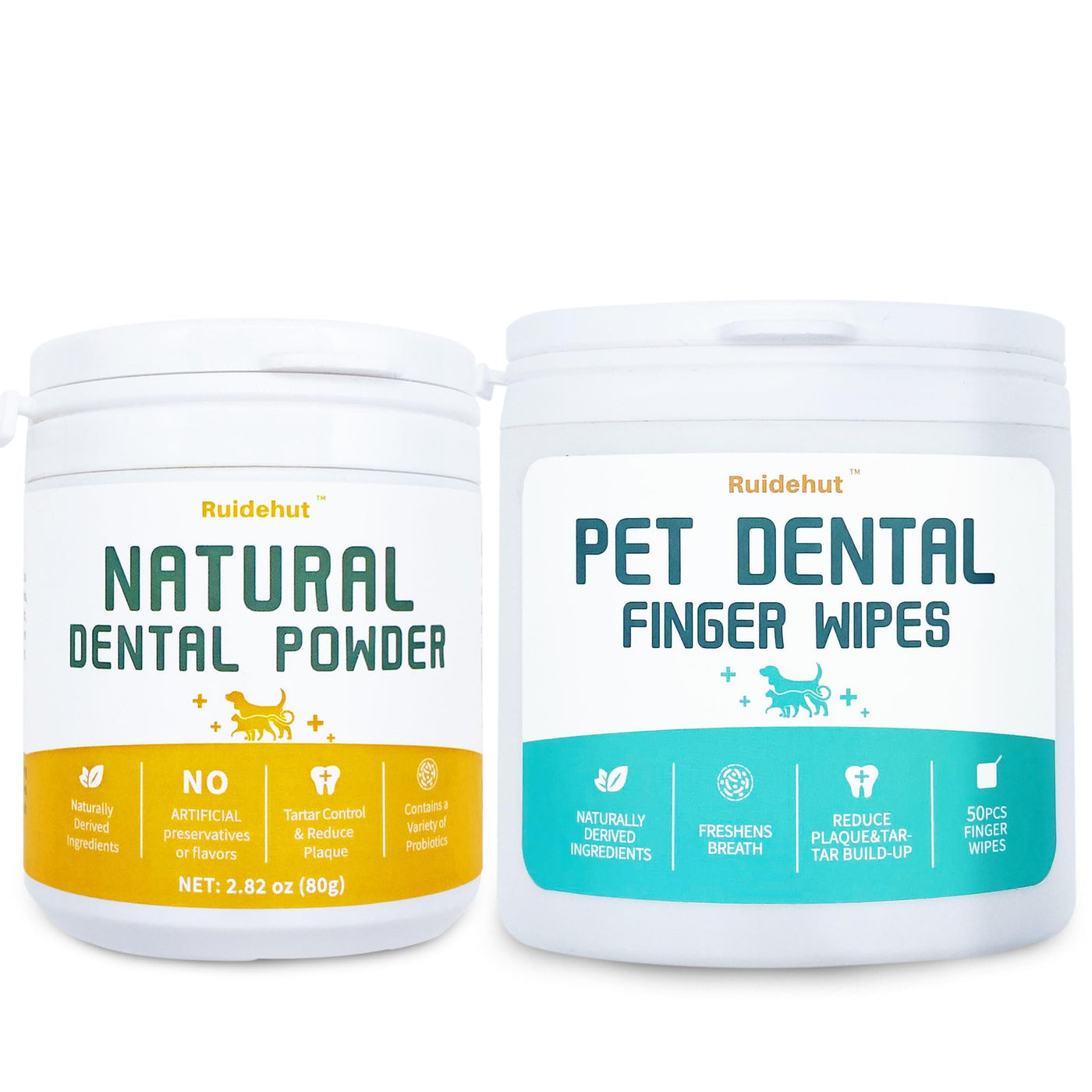 Dog Dental Kit - Teeth Cleaning Powder Contains Probiotics That Solve Bad Breath Through Internal Digestion, Finger Wipes Remove Plaque and Tartar from The Surface (50 Count & 80g)