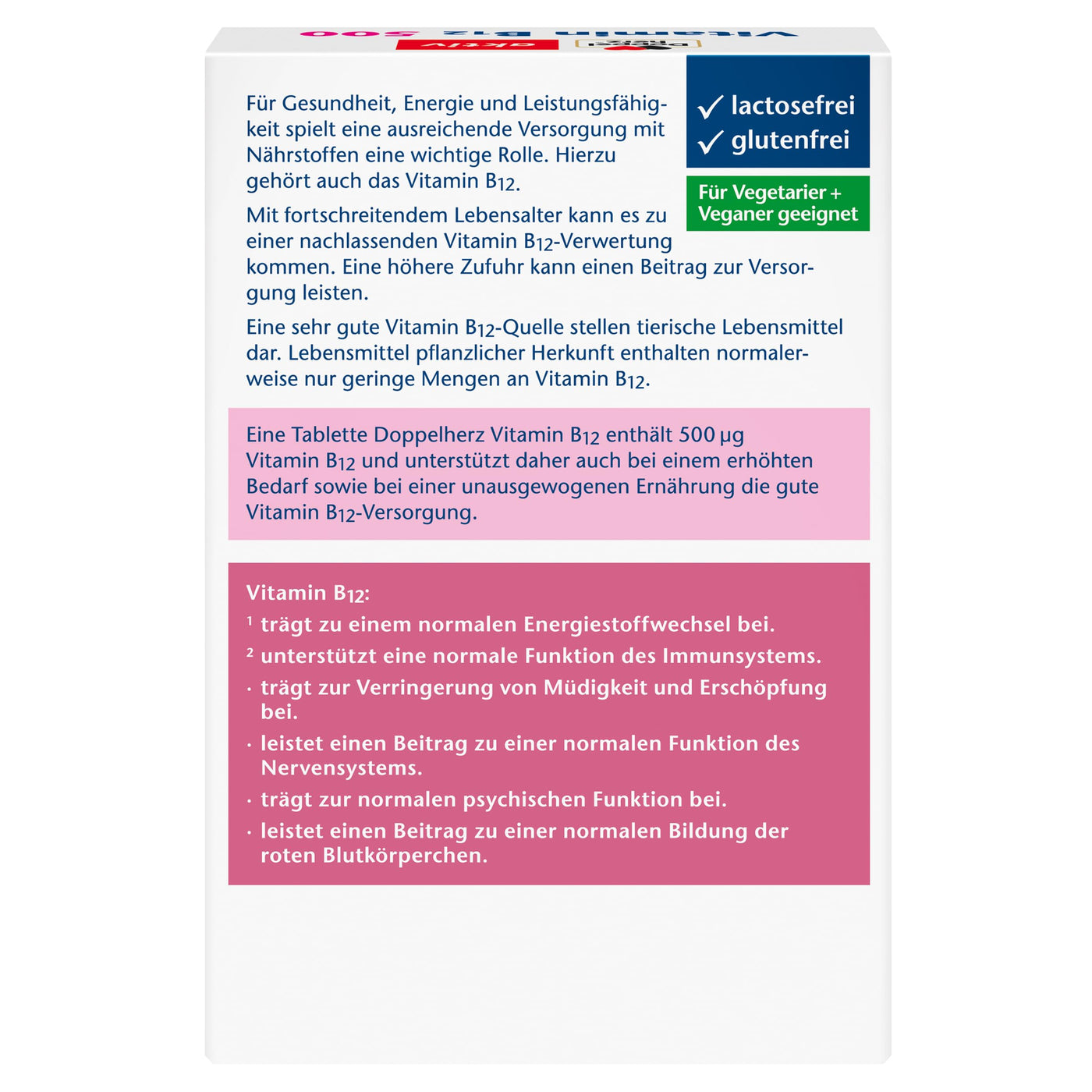 - HIGH DOSE OF VITAMIN B12: One tablet of Doppelherz Vitamin B12 contains 500 g of vitamin B12 and therefore supports a good supply of vitamin B12 even when there is an increased need or an unbalanced diet