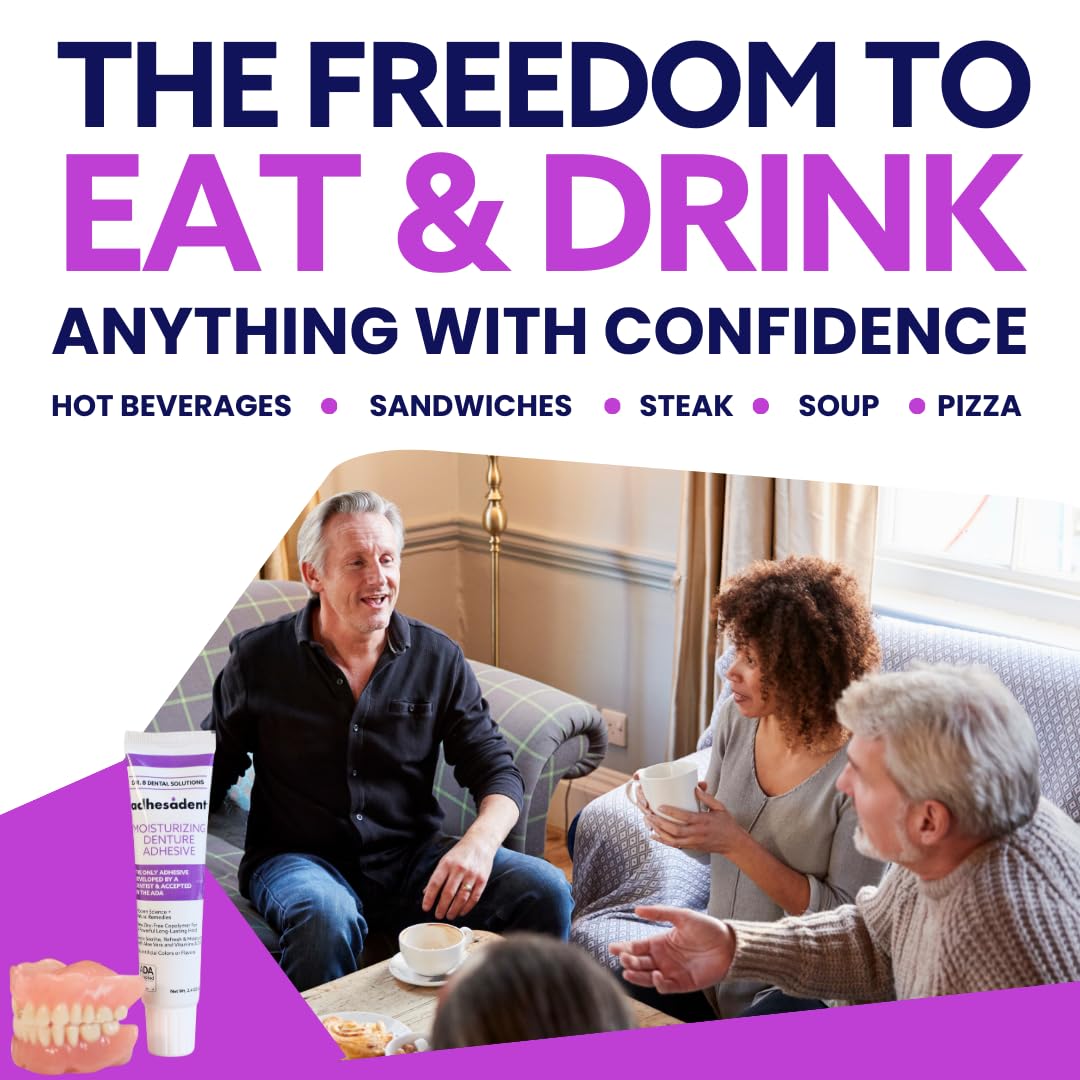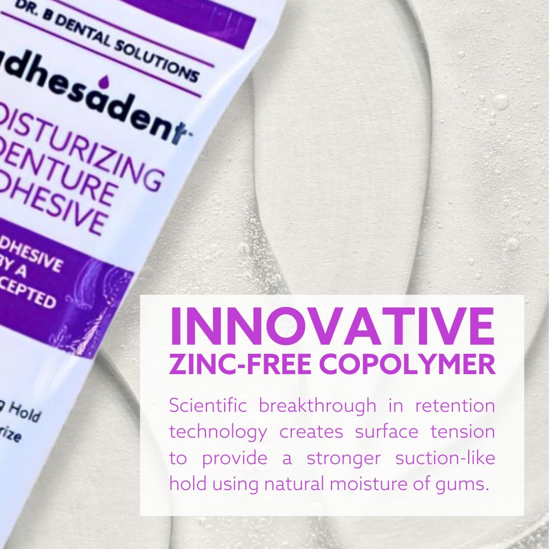 - Secure And Reliable Fit - Adhesadent Moisturizing Denture Adhesive is your go-to adhesive for dentures. Thanks to its powerful zinc-free copolymer, you'll enjoy a comfortable, long-lasting hold for all kinds of dentures.