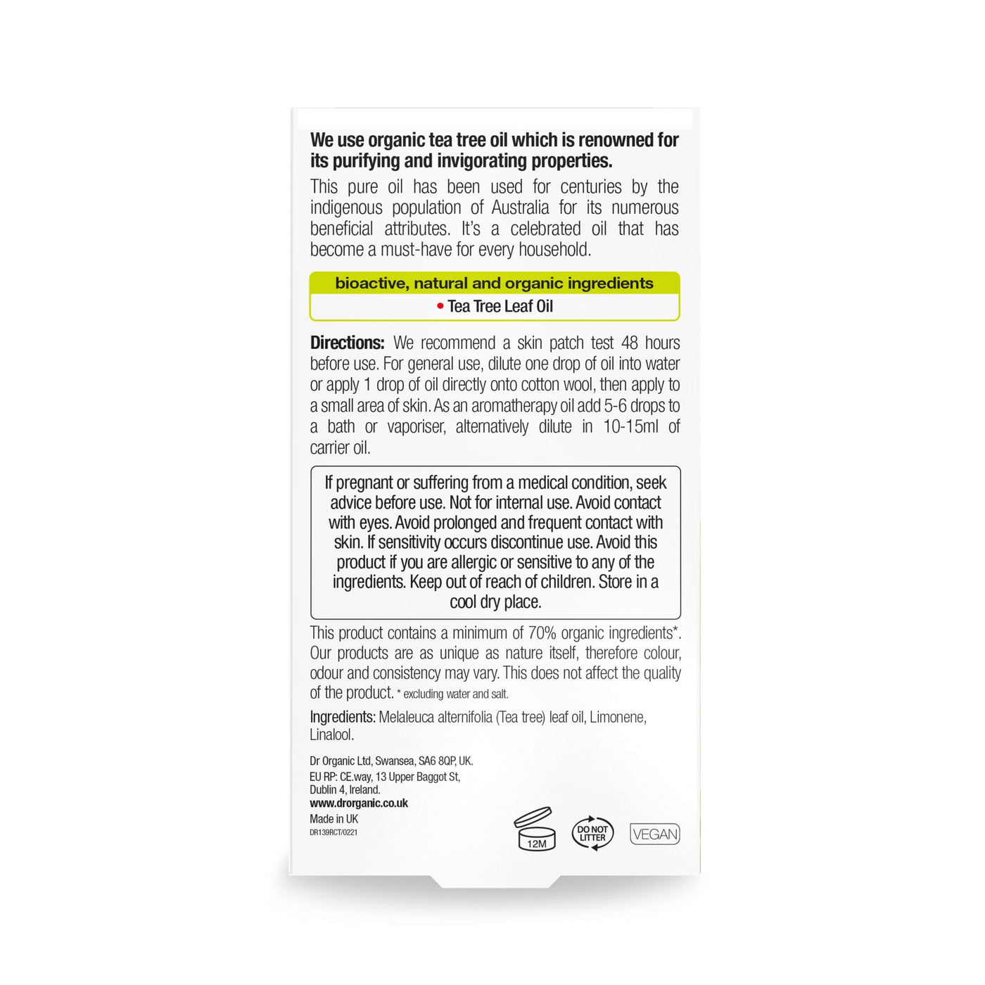 We use organic tea tree oil which is renowned for its purifying and invigorating properties. This pure oil has been used for centuries by the indigenous population of Australia for its numerous beneficial attributes. It's a celebrated oil that has become a must-have for every household. Ingredients Melaleuca alternifolia (Tea tree) leaf oil, Limonene. P.when('A').execute(function(A) { A.on('a:expander:toggle_description:toggle:collapse', function(data) { window.scroll(0, data.expander.$expander[0].offsetTop-100); }); }); Directions We recommend a skin patch test 48 hours before use. For general use, dilute one or two drops of oil into water or apply directly onto cotton wool, then apply to the skin. As an aromatherapy oil add 5-6 drops to a bath or vaporiser, alternatively dilute in 10-15ml of carrier oil. See more