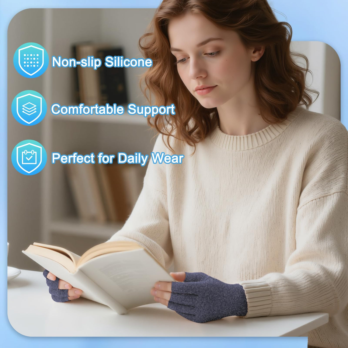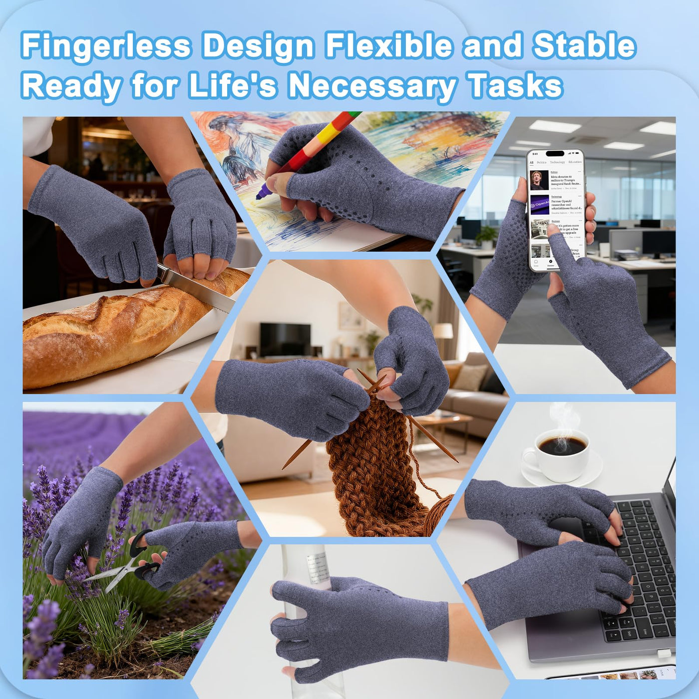 - Finger-free Design : Arthritis gloves for men and women, using fingerless design, Perform everyday tasks like using phone, typing, cooking, and more without interference. The opening is set at optimal length to provide a perfect balance between beneficial compression support and finger/thumb mobility
