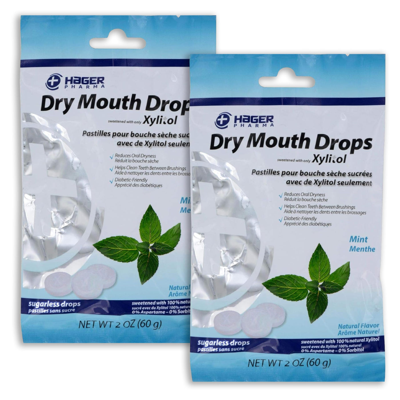Hager Pharma Dry Mouth Drops are mint-flavored, sugar‚Äëless lozenges specifically formulated to relieve oral dryness and promote saliva production. . They are sweetened exclusively with 100% natural xylitol, making them tooth‚Äëfriendly, diabetic‚Äëfriendly, and low calorie