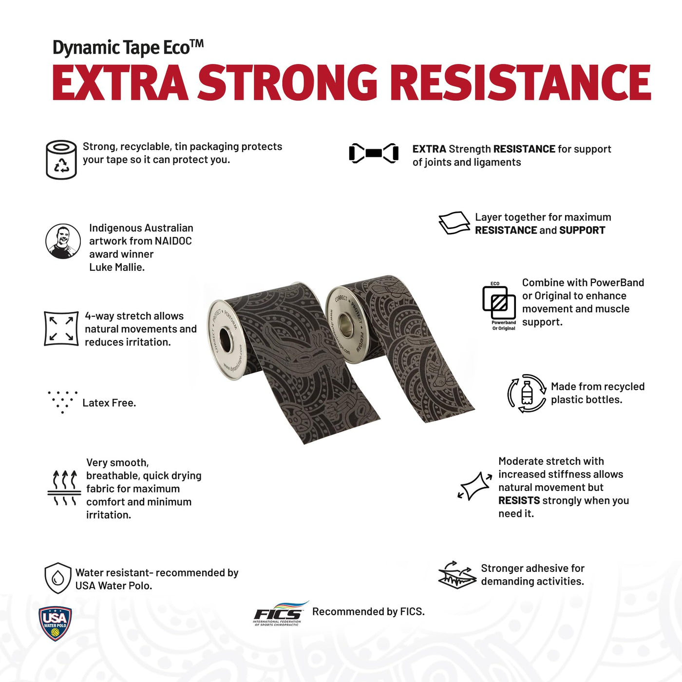 - Eco Tape, Elite Performance High-resistance 4-way stretch physio tape designed to support muscles, tendons & ligaments