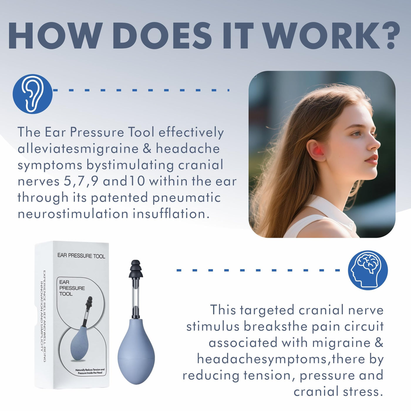 - Natural and safeThe ear pressure relief device offers a natural and safe solution to reduce tension, stress, and symptoms like insomnia and migraines. It achieves this through gentle pressure stimulation, without the need for medication or invasive procedures.