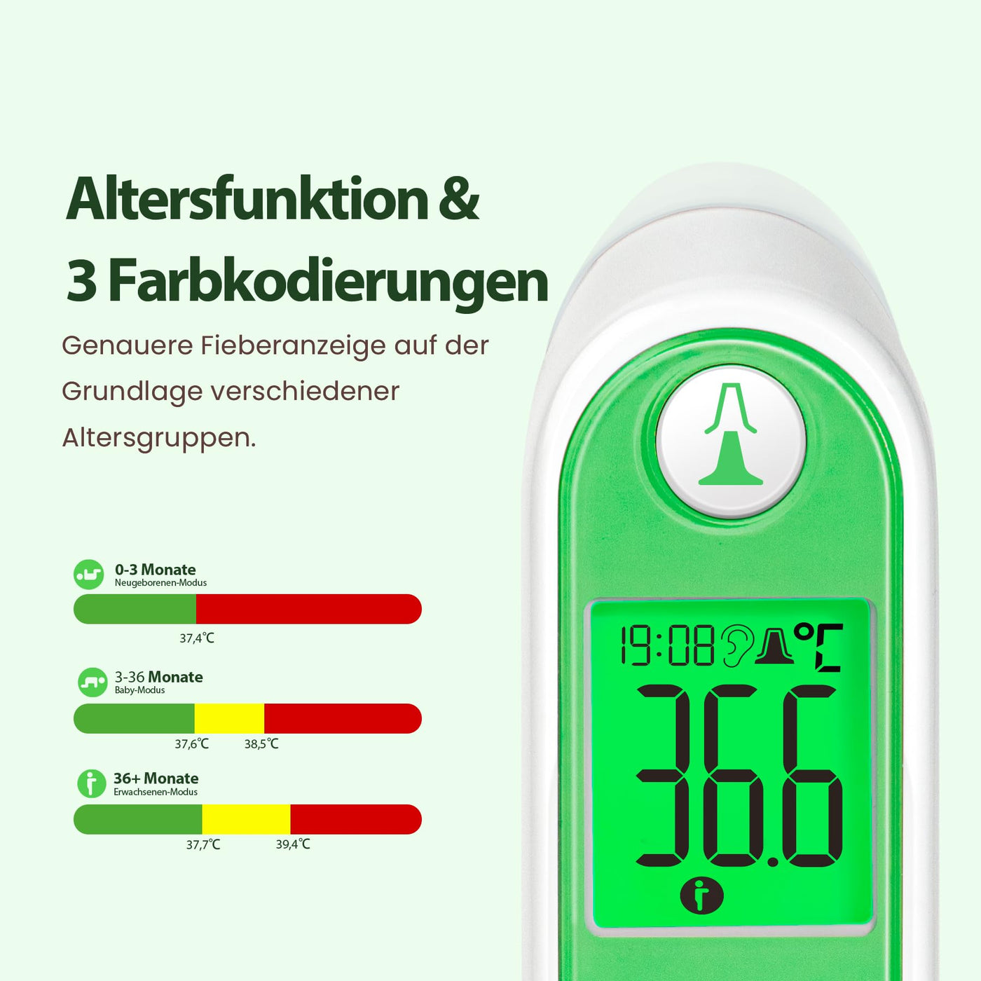 Ear Thermometer for Baby Adults, Ear Fever Thermometer with Age Measurement and Color-Coded Temperature Display, Digital Infrared Thermometer with 21 Disposable Protective Caps (Green)