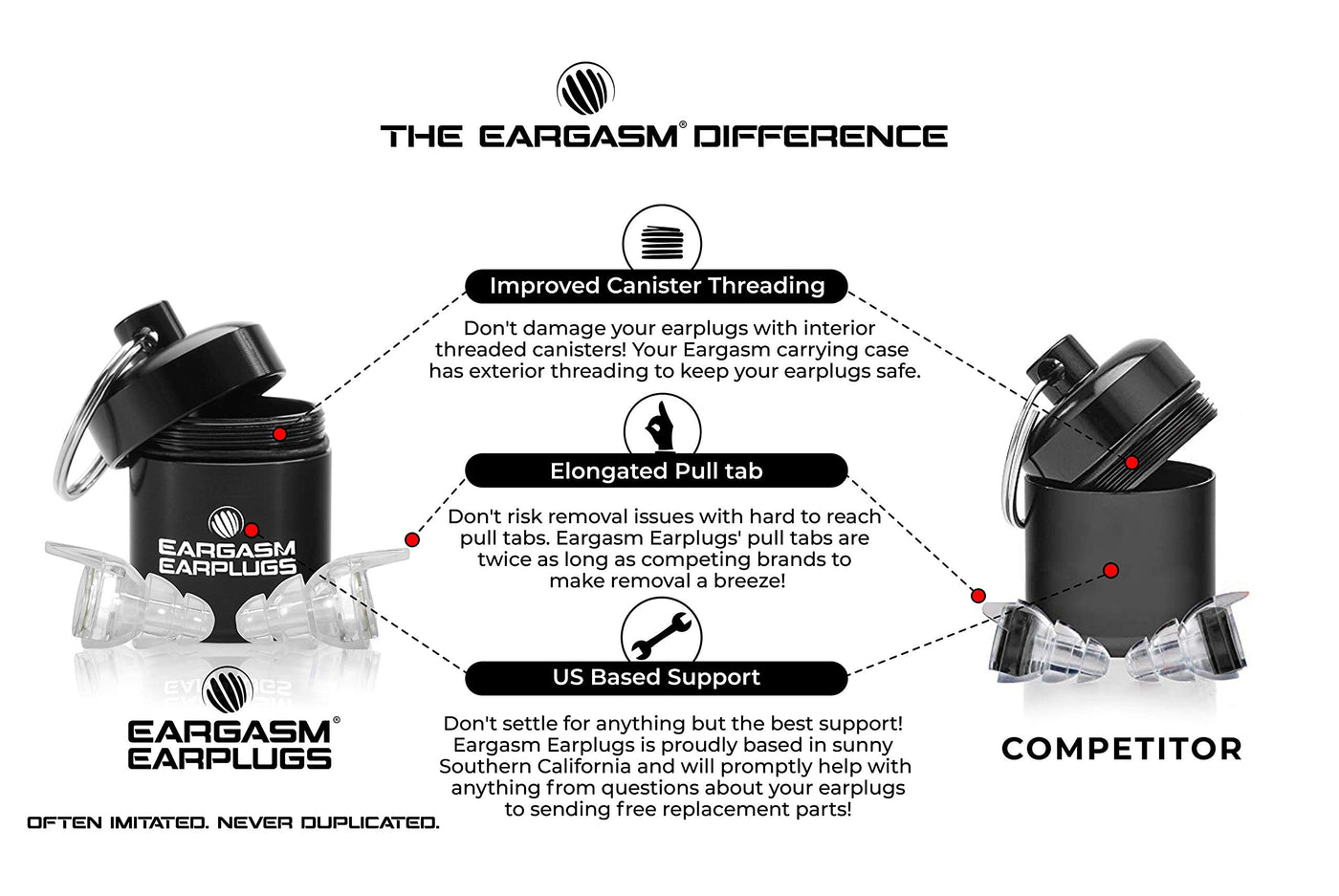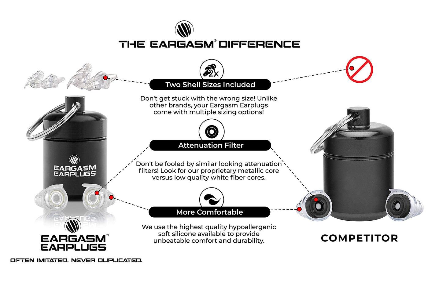 ABOUT US Eargasm Earplugs is based out of sunny Southern California and started with the idea that in the 21st century, the simplistic foam earplug needed an upgrade. Foam earplugs are designed to completely block out the world around them. However, in today's world there are so many situations where people still want to interact with their surroundings, just at a lower volume. Our earplug’s patent pending design solves this problem by filtering, rather than blocking out, sound to a manageable level. The Revolution in Hearing Protection Has Arrived Contains two shell sizes to comfortably fit most ear sizes and the discreet, low profile design make them nearly imperceptible to others. Whether you're at a concert, a musician performing with your band, riding your motorcycle, or numerous other environments, Eargasm High Fidelity Earplugs help you turn the volume down anytime you need it. Multiple Shell Sizes to get the Perfect Fit Discreet Design Made with Hypoallergic Soft Silicone Up to a 21 dB drop in Noise Levels (NRR 16 dB) Read more Reduce Noise without Compromising Quality Eargasm Earplugs reduce noise levels proportionally while maintaining sound integrity. It is like having your own volume knob for life! You hear everything, but at safe and enjoyable levels. At the heart of each ear plug is an attenuation filter. These filters reduce noise to safe levels while preserving clarity of speech and richness of music. Sounds are reproduced exactly as your ear would hear them but at a reasonable volume. Multiple Uses Whether you're at a concert, a musician performing with your band, riding your motorcycle, or numerous environments, Eargasm High Fidelity Earplugs help you turn the volume down anytime you need it. Hypoallergenic Soft Silicone Eargasm High Fidelity Earplugs have a soft, clear silicone exterior so they nestle gently in your ear and become imperceptible to others. Waterproof Casing Waterproof rubber seal ensures protection from moisture, dust and debris. Threading is uniquely placed on exterior of canister to prevent damage to earplugs when opening and closing. Reduce Noise without Compromising Quality Multiple Uses Hypoallergenic Soft Silicone Easy Transport Sizes Normal to Large Ear Canals Small Ear Canals Normal to Large Ear Canals All Ear Sizes Two Sizing Options Use Cases Live events, motorcycle riding, noise sensitivity Live events, motorcycle riding, noise sensitivity Live events, motorcycle riding, noise sensitivity Sleeping, studying, traveling Air travel, altitude changes Noise Reduction Ability Up to 21 dB (NRR 16 dB) Up to 21 dB (NRR 15 dB) Up to 21 dB (NRR 16 dB) NRR 32 dB Reduce ear pain during air travel