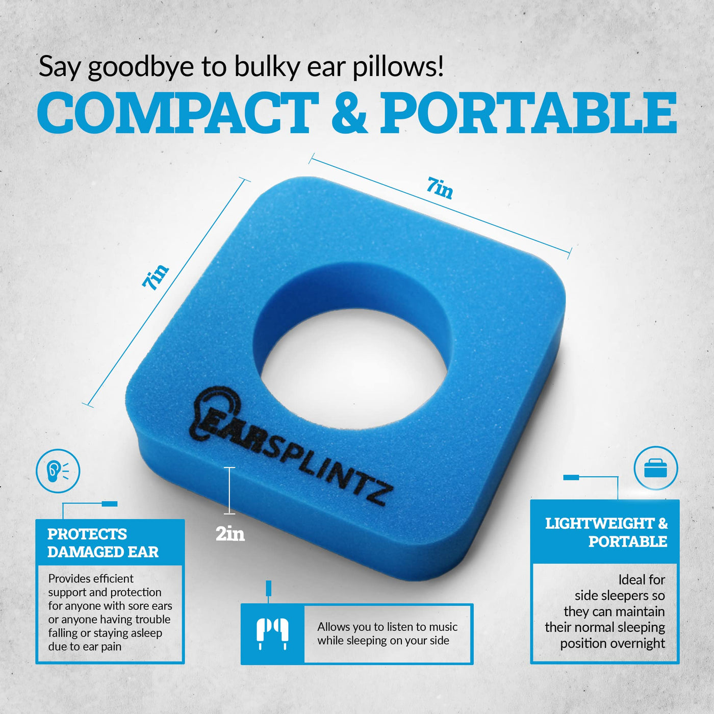 - Compact & Portable - Say goodbye to bulky ear pillows! Our 7in x 7in x 2in pillow with ear hole for side sleepers is lightweight & portable for your convenience. Travel with it anywhere for easy support & comfort.