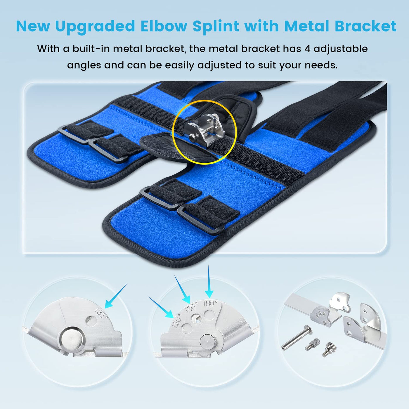 - 4 Angles adjustment design: The biggest feature of this elbow brace upgrade is that there are 4 angles that can be adjusted, namely 120, 135, 150, and 180.This is a design that we have patented,it is very unique and effective.It can be easily adjusted by inserting a screw into the hole where you need the gear to be fixed. It provides you with the best support, normal life will not be affected, and it can effectively avoid continuous bending of the elbow joint.