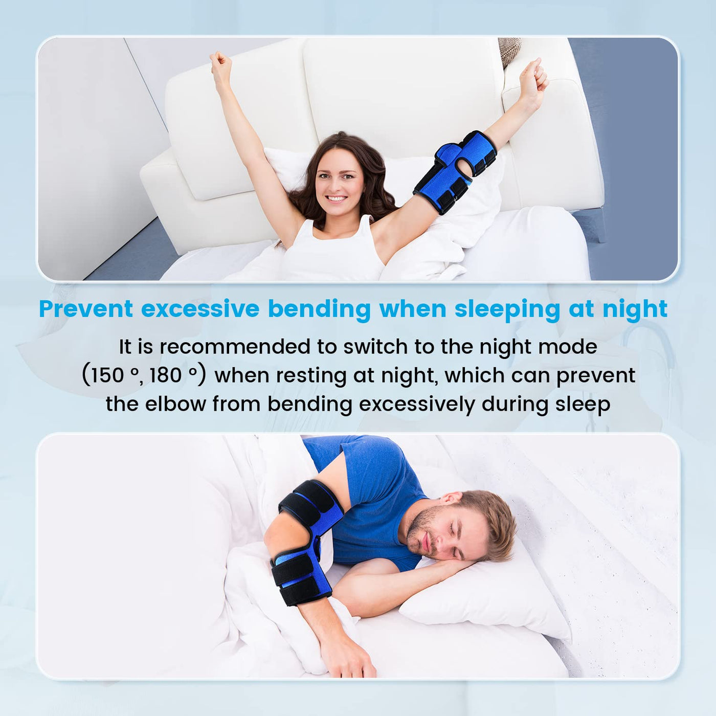 - All-day use and free adjustment: When resting at night, it is recommended to switch to night mode (150, 180), which can prevent excessive bending of the elbow during rest and sleep; for daytime use, you can also adjust the elbow brace to day mode (120, 135, 150) to facilitate your work. It has 4 hook and loop straps, corresponding to the upper and lower arms, which allow you to freely adjust the elasticity of the elbow splint for more effective compression and support.