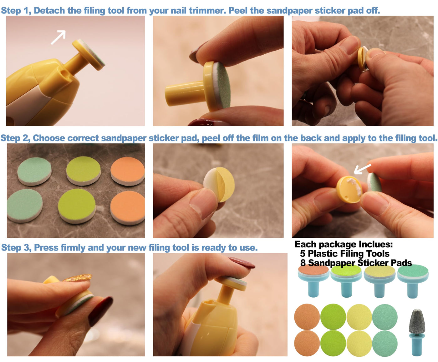 - Sandpaper Pad Tools: 8 various colored Adhesive Replacement sticker pads, +5 trimmer tools on Green plastic base, matches Royal Angels Electric Nail Trimmer Yellow Color.