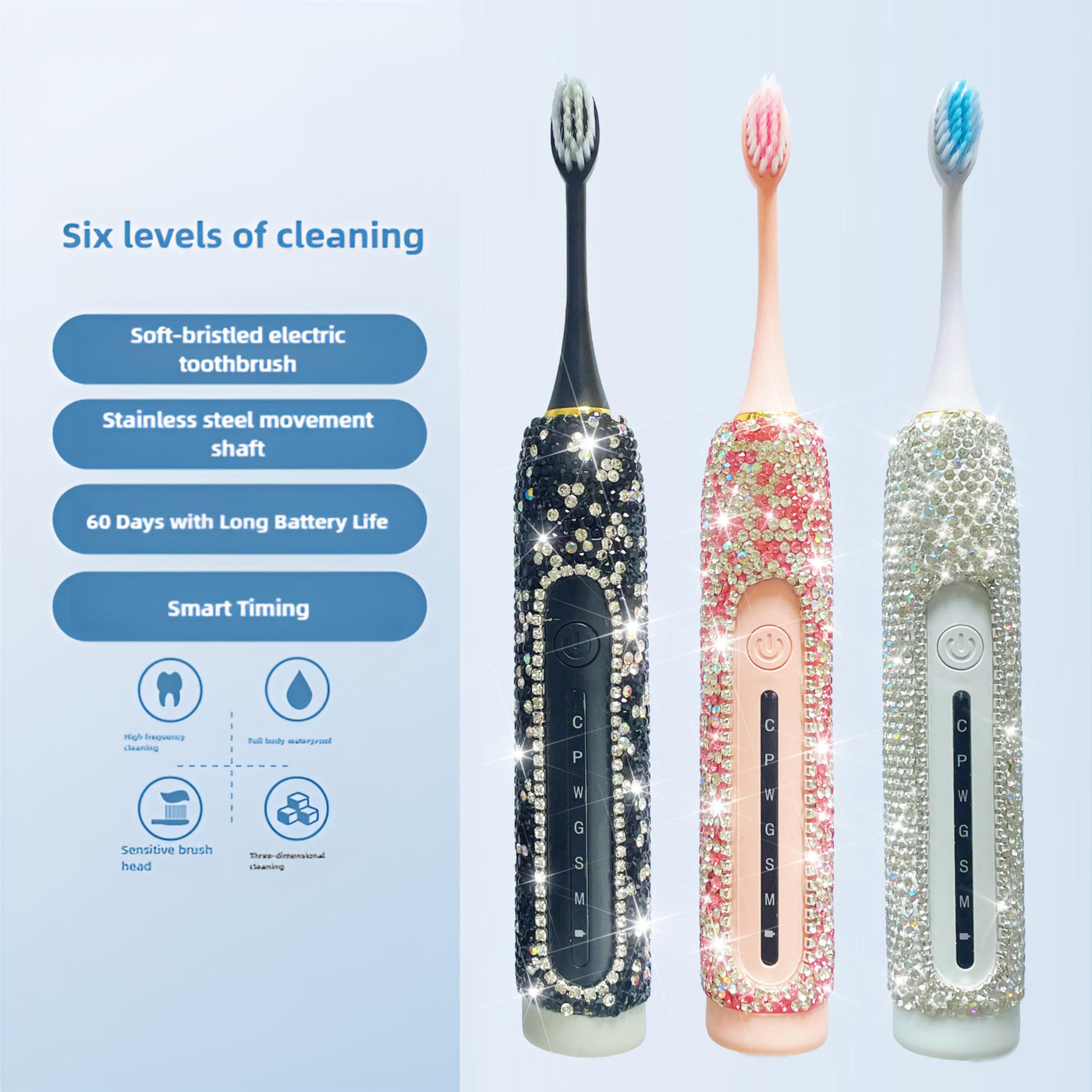 - Stylish Bling Design: This electric toothbrush is decorated with glamorous diamond accents, available in silver, black, and pink, making it a chic essential for your daily routine.