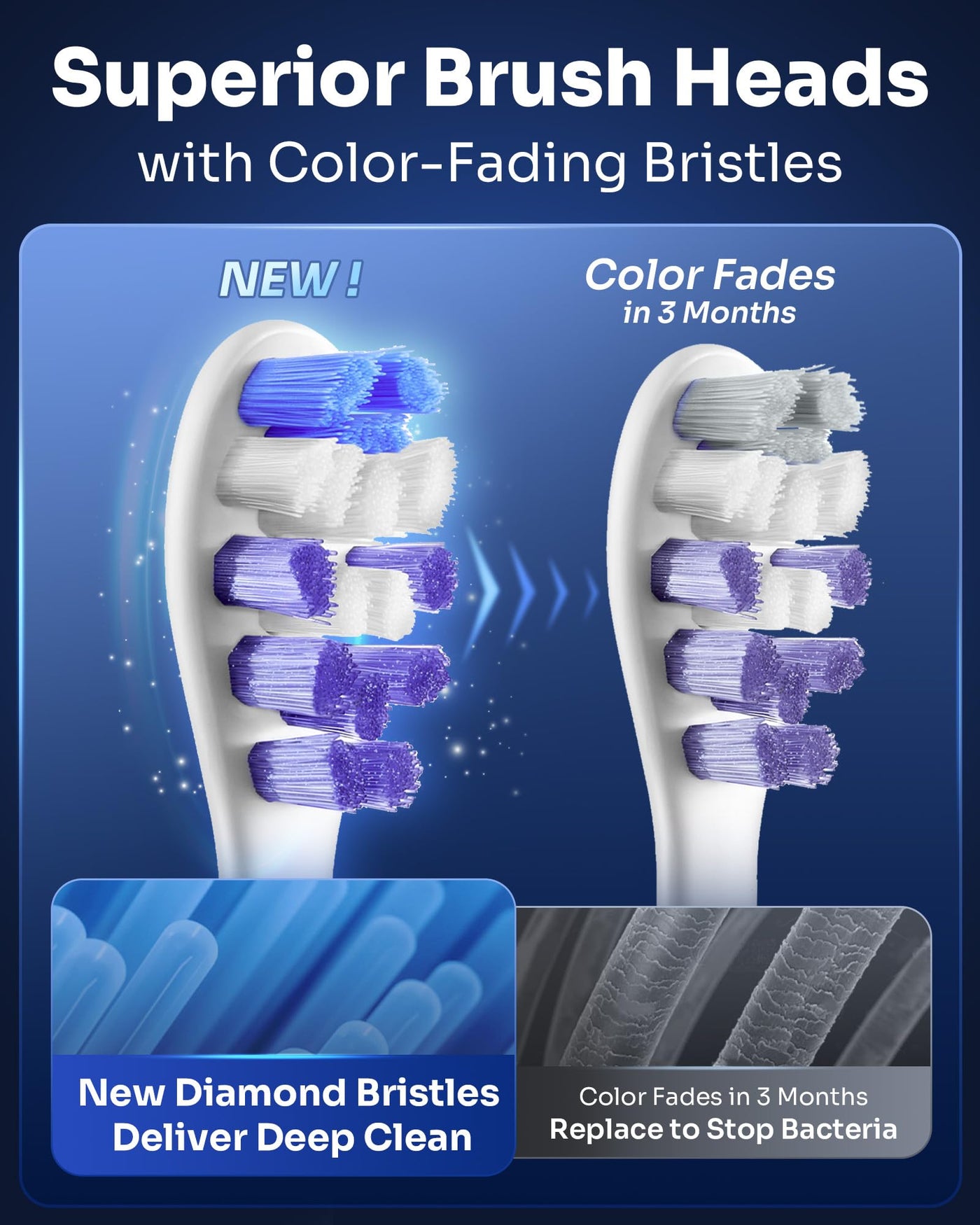 - 2 DIAMOND REPLACEMENT BRUSH HEADS: Our high quality 'w shaped diamond bristles reach where normal manual toothbrush DONT. Notice: Blue indicator bristles fade in color to remind you of brush heads replacement every 3 months.