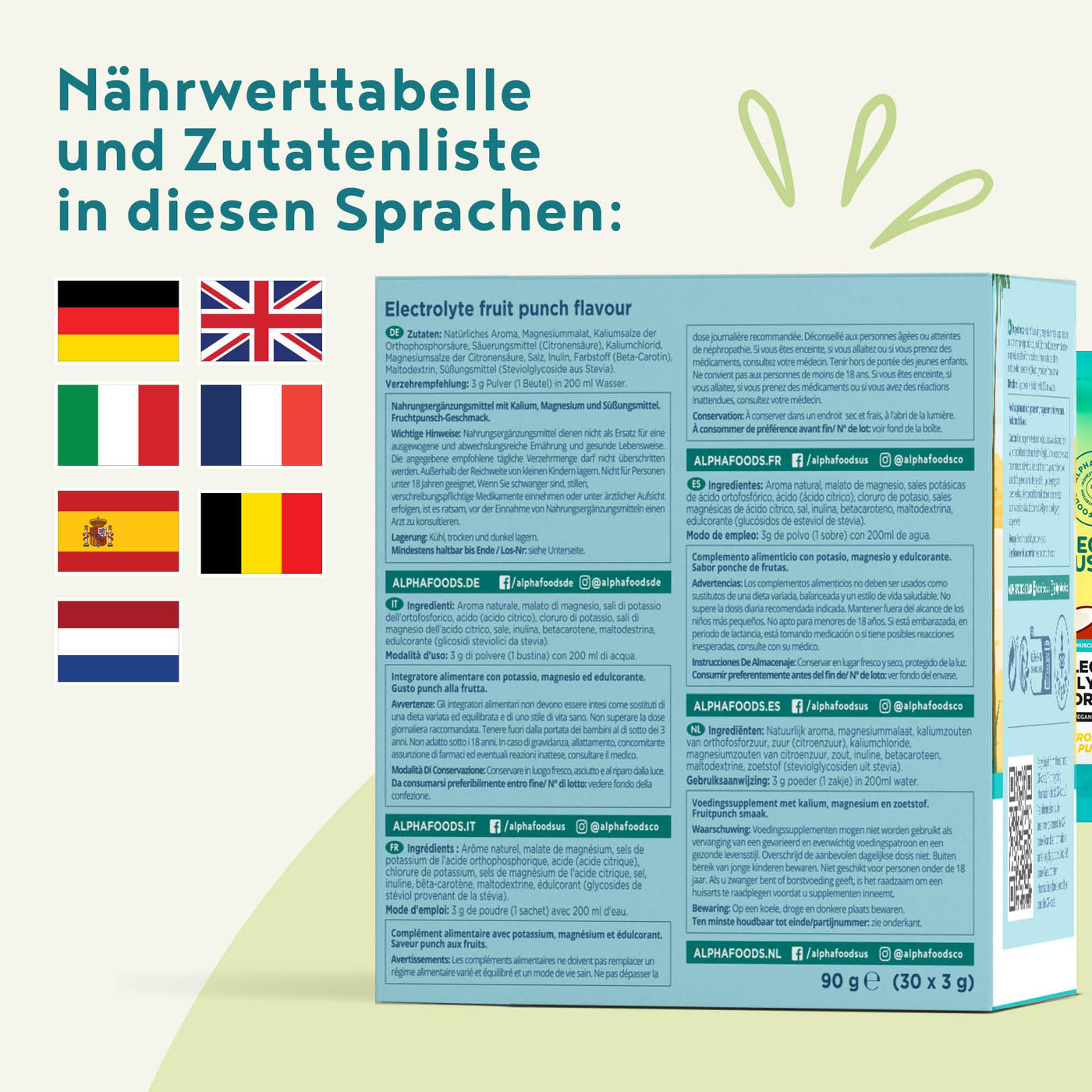 - Cramps, headaches, tiredness, poor concentration, sleep disorders or even cravings can indicate a disturbed electrolyte balance. Alpha Foods Electrolytes therefore contain the naturally occurring electrolytes sodium, magnesium and potassium and come in 30 portions of 6g each. Since the human body cannot produce potassium and magnesium itself, potassium and magnesium needs must be met through food.