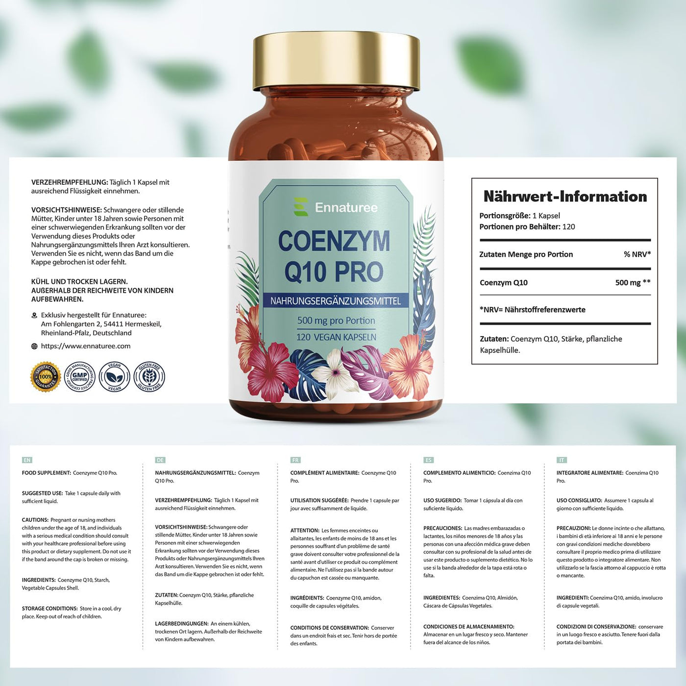 Ennaturee Coenzyme Q10 Pro Capsules 500mg High Dose 120 Vegan Capsules 4 Month Range Antioxidant Coenzyme Q10 Supplements Natural and High Bioavailability Laboratory Tested
