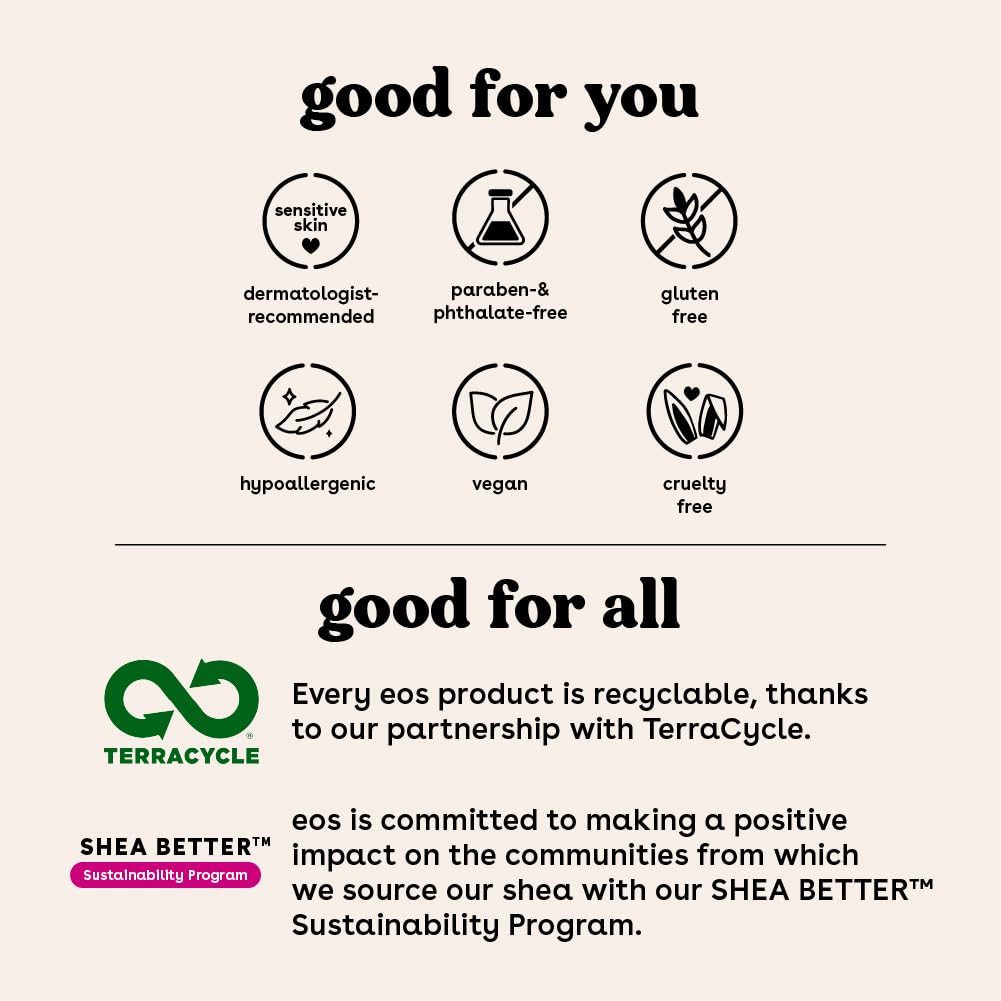 - CASHMERE SMOOTH COMPLEX: eos Shave Cream contains the most naturally moisturizing & protective butters for velvety soft, cashmere smooth skin: shea butter softens & nourishes, cocoa butter hydrates while argan butter soothes & makes skin smooth