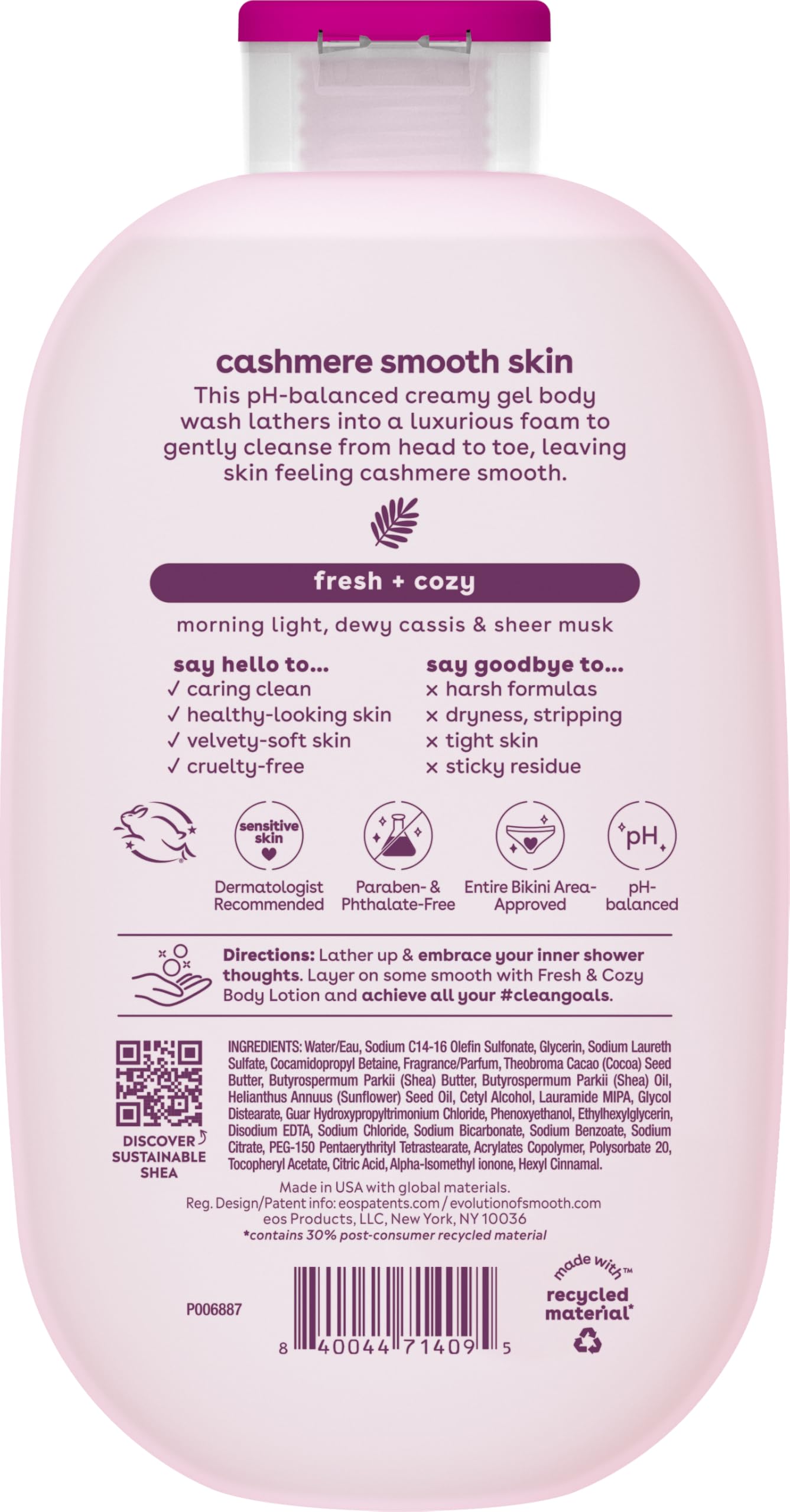 eos Shea Better Fresh & Cozy Body Wash is pH balanced to cleanse from head to toe. This hydrating body wash combines the fresh, foamy clean of a shower gel body wash with the nourishing, non-stripping care of a cream. It leaves your skin feeling silky-smooth and cashmere-soft. This eos body wash women is made with our Cashmere Smooth Complex, a rich blend of shea butter, cocoa butter, and argan butter. Say hello to your everyday body wash that can be added to your collection of shower and skin care products