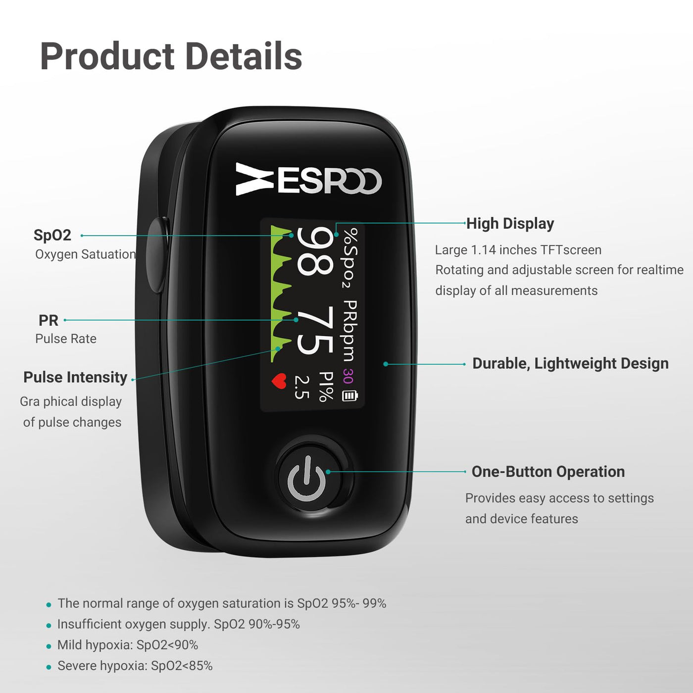 - Lightweight & Portable Design: Compact and portable, the ESPOO oximeter is easy to carry, fitting seamlessly into daily life for everyday user