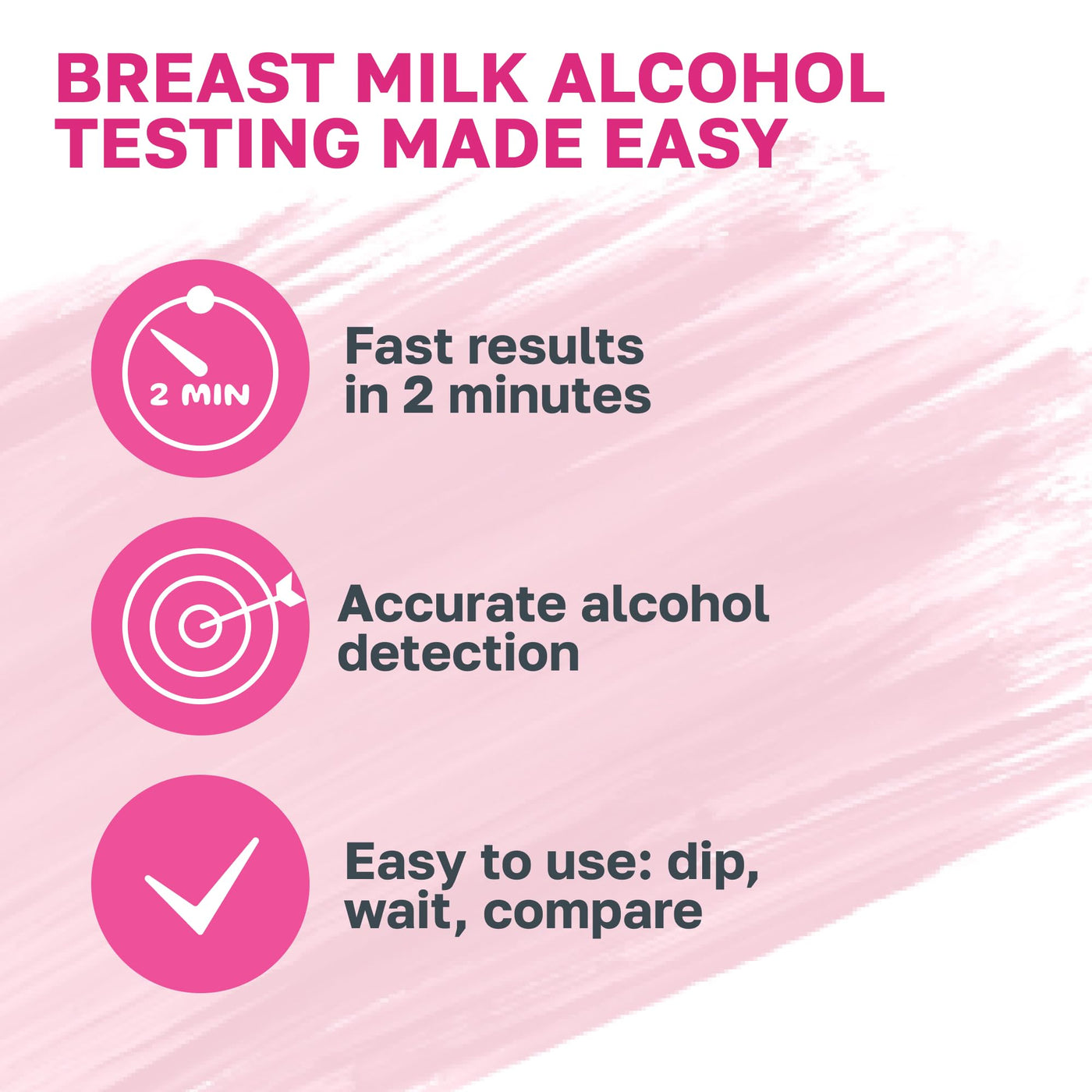 - EASY TO USE BREAST MILK ALCOHOL TEST STRIPS FOR BREASTFEEDING MOTHER. Dip the breastmilk alcohol testing strips for 5-10 seconds and then read results, color changing pad is easy to read & interpret, Alcohol Test Strips for Breastmilk individually sealed with user-friendly instructions for easy home alcohol tests.
