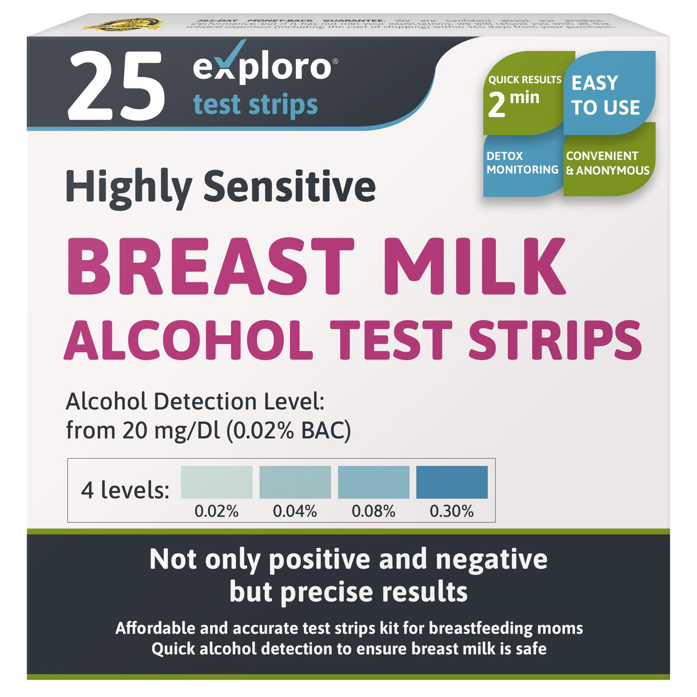 - HIGHLY SENSITIVE BREASTMILK ALCOHOL TESTING STRIPS. Ensure baby's safety with Exploro's breastmilk test strips alcohol, designed to detect alcohol presence in breastmilk for 4 levels 0.02%, 0.04%, 0.08%, 0.30% BAC (20,40,80, 300 mg/dL), Exploro Alcohol breast milk test strip is designed for at home testing of breast milk for accurate results.