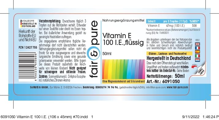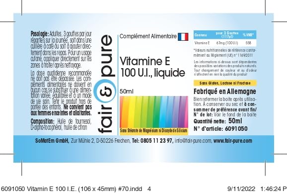 - Vitamin E 100 IU liquid, vitamin E-Ol, 50ml - The product is gluten-free, fructose-free and lactose-free as well as free of magnesium stearate, silicon dioxide, colors, flavors and preservatives