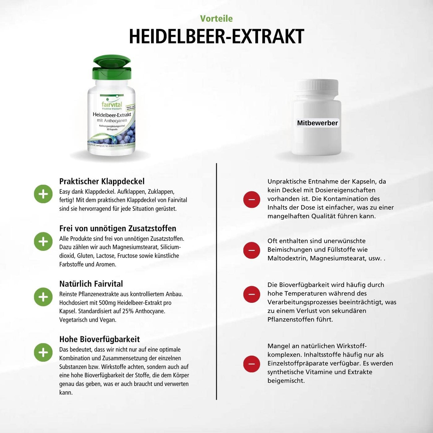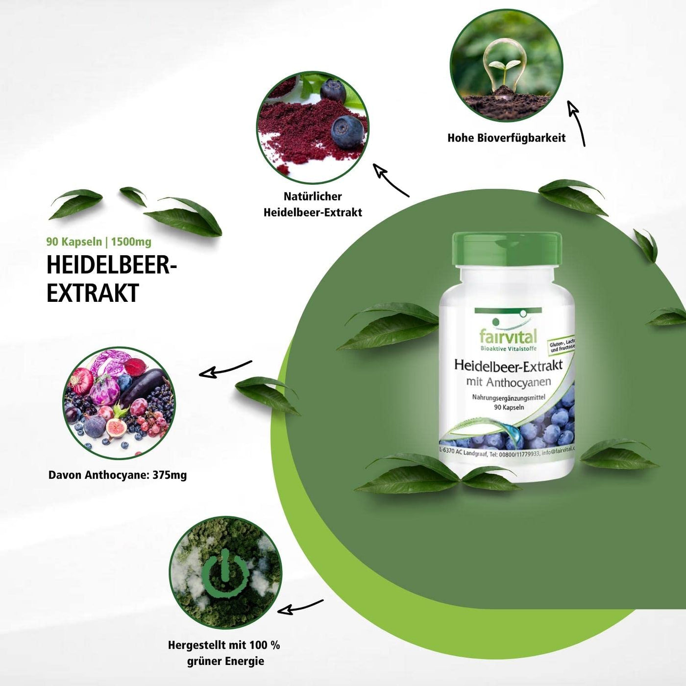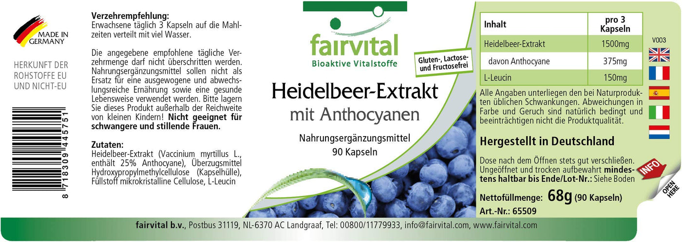 - Fairvital GERMAN QUALITY: Daily dose: 3 capsules per day contain 1500mg blueberry extract, of which 375mg anthocyanins. High dosage! Excellent price-performance ratio! High-dose blueberry extract!