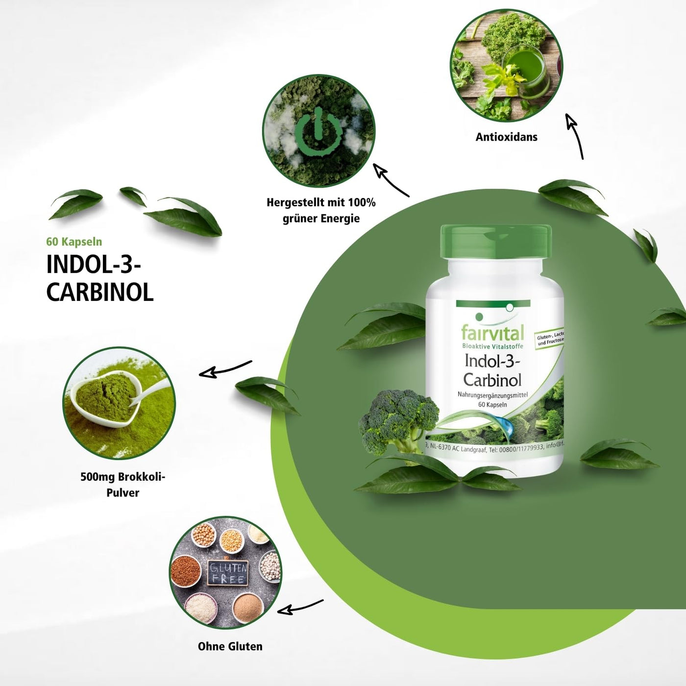 - Fairvital GERMAN QUALITY: Daily dose: 2 capsules per day contain 500mg indole-3-carbinol and 500mg broccoli powder. High dosage! Excellent price-performance ratio! Natural antioxidants.