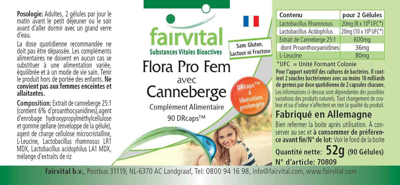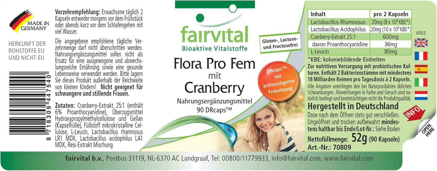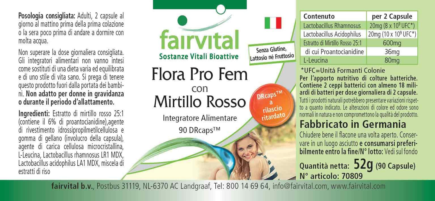 • Fairvital GERMAN QUALITY: Daily dose: 2 capsules per day contain 20mg Lactobacillus rhamnosus, 20mg Lactobacillus acidophilus and 600mg cranberry extract, of which 36mg proanthocyanidins. High dosage! Excellent price-performance ratio!