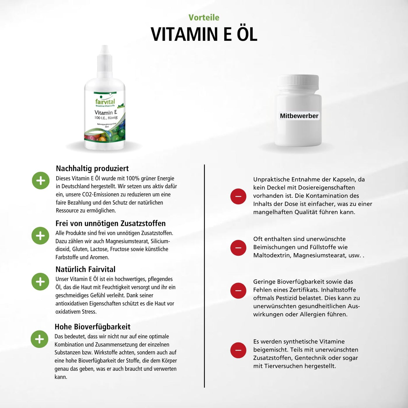 - BIOAVAILABLE & WITHOUT: gluten, fructose, lactose, magnesium stearate, preservatives, soy, yeast, pesticides, fungicides, artificial fertilizers, dyes, stabilizers and genetic engineering (NON-GMO). VEGAN vitamin E oil without animal ingredients!