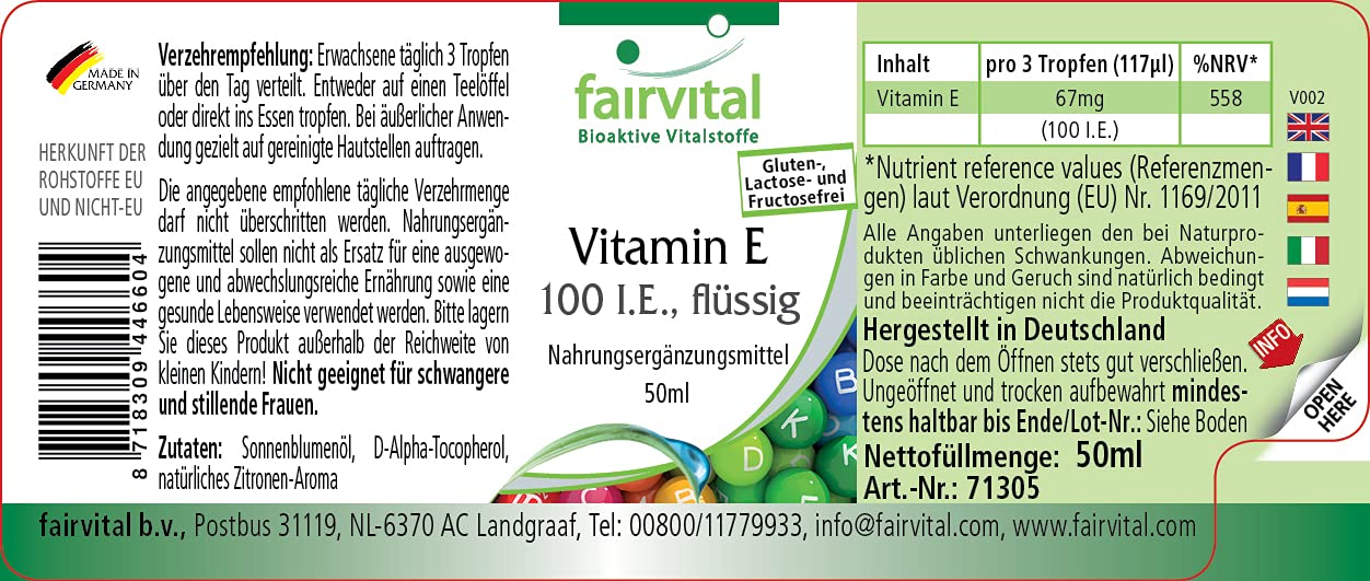 - Fairvital GERMAN QUALITY: Daily dose: 3 drops per day contain 67mg (100 IU) of vitamin E. High dosage! Excellent price-performance ratio! With lemon oil for a pleasant taste.