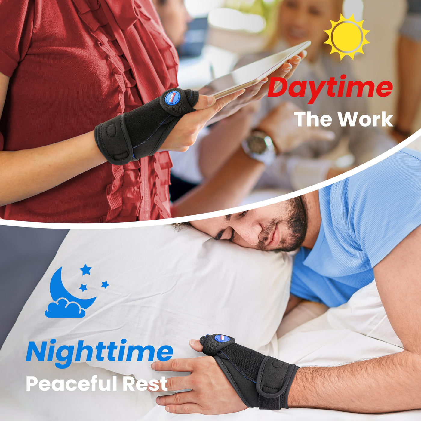 - Easy to Wear for All Day FEATOL thumb brace is eaay to wear with two adjustable straps, one is for thumb and the other is for wrist, which will give better fitting. Breathable fabric for daily work and night support, comfortable all day
