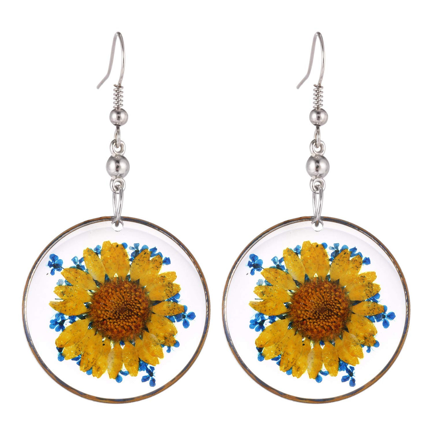 FM FM42 Multi-Colored Pressed Daisy & Queen Anne's Lace Flowers 1.14" Round Circle Drop Dangle Hook Earrings, 7 Colors