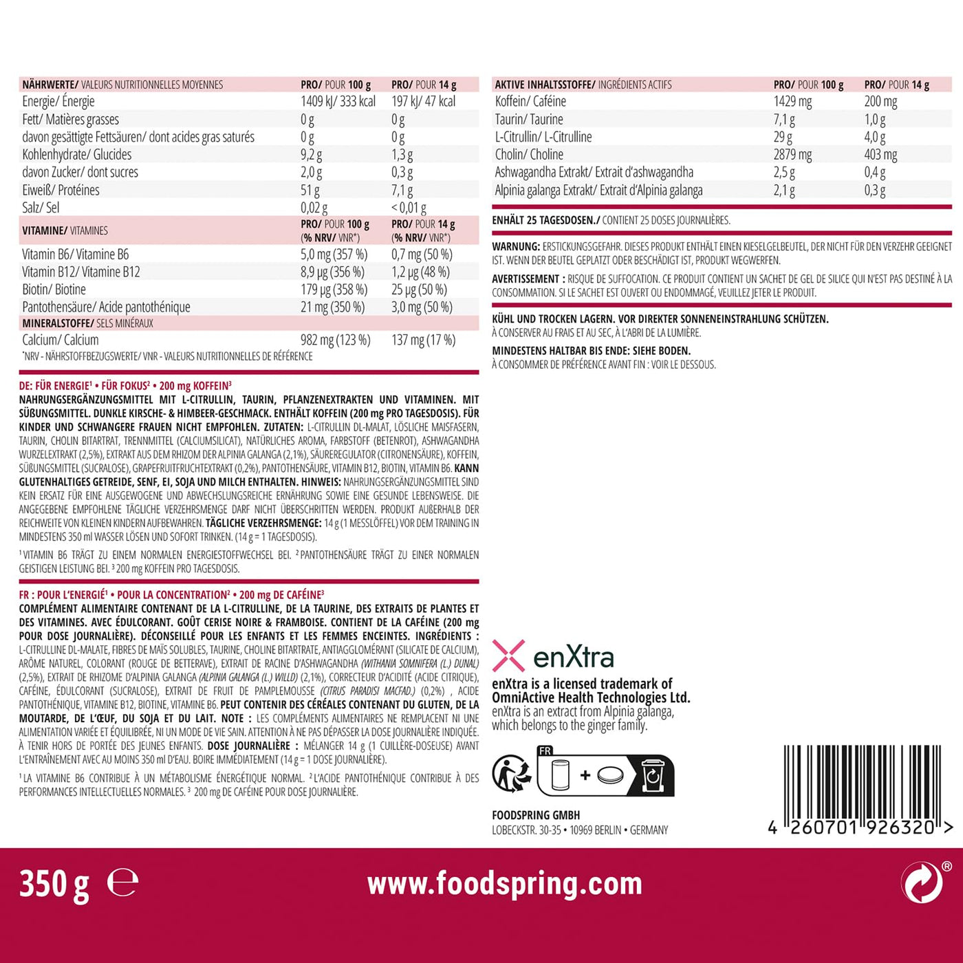 foodspring All-in-One Pre-Workout Booster for Energy & Focus - 200mg Caffeine Per Serving & Sugar Free - with EnXtra, Taurine, Citrulline, B6, B8, Choline & Ashwagandha (350g | Dark Cherry &
