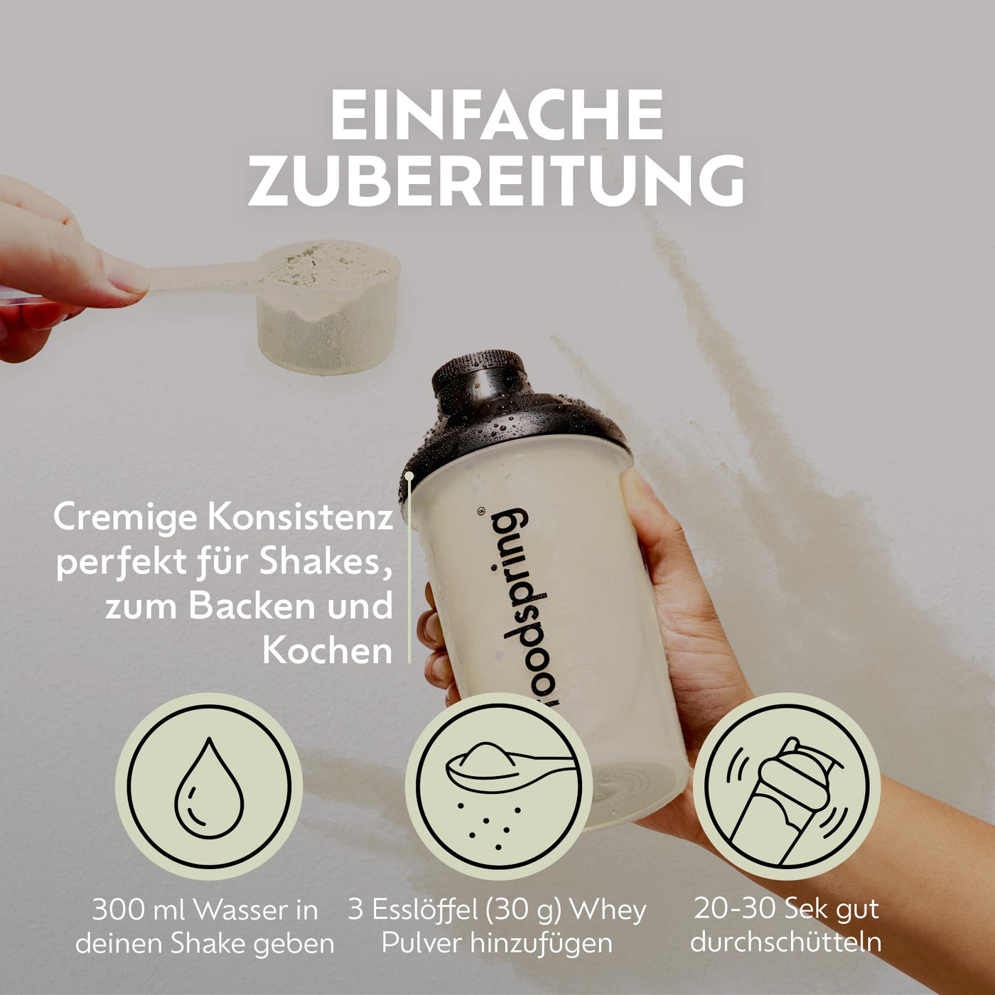 - Clump-free shakes thanks to perfect solubility: simply add three tablespoons (approx. 30 g) to 300 ml of water or milk and shake - your creamy, lump-free shake is ready.