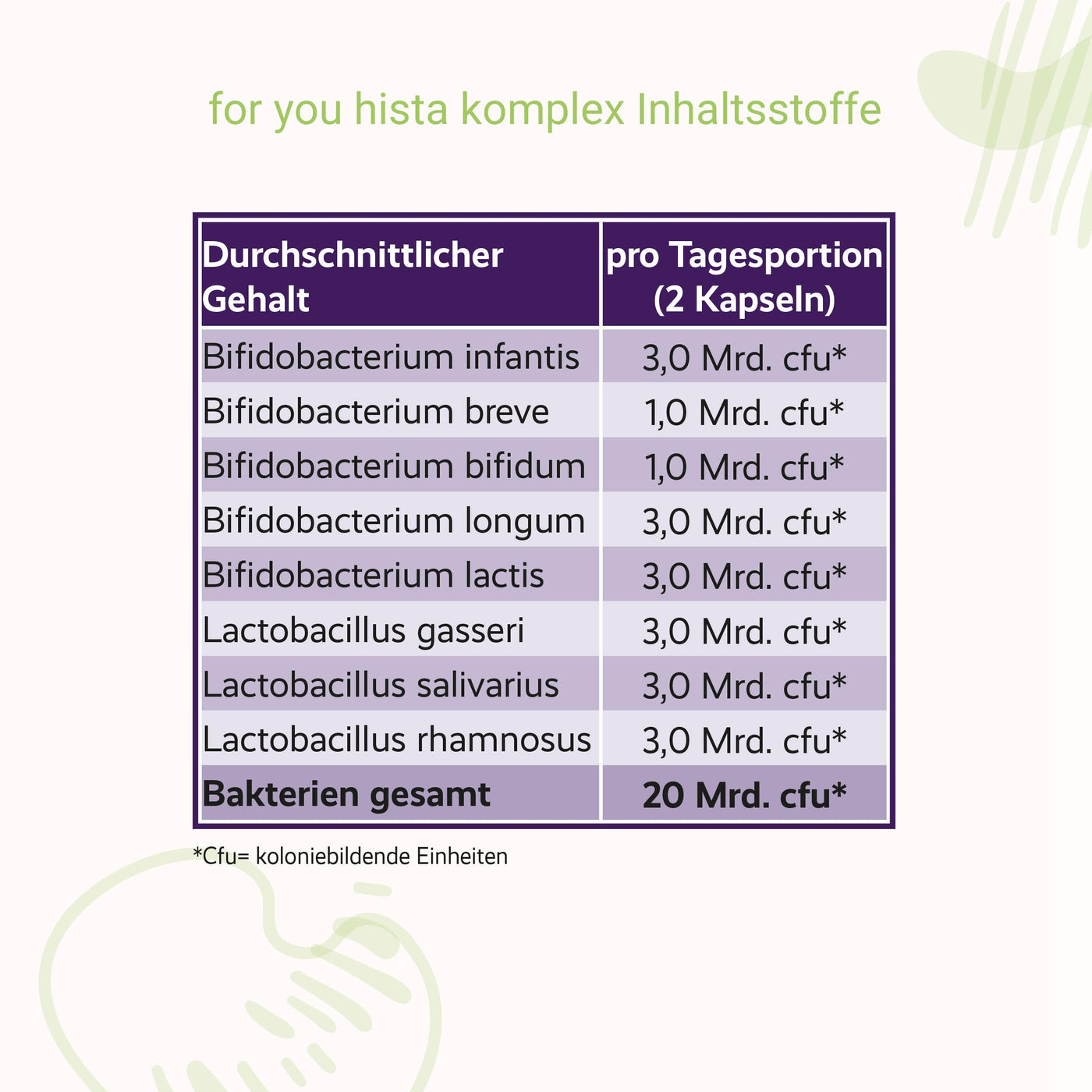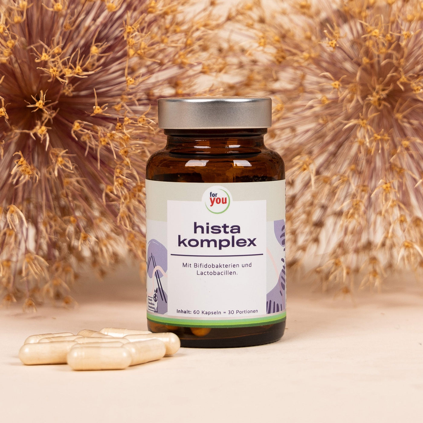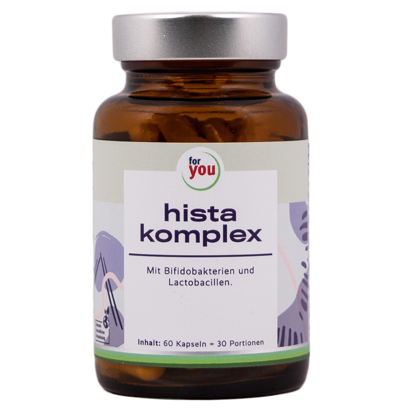 for you hista complex - specially developed for people with histamine intolerance - with bifidobacteria and lactobacilli - 20 billion bacteria per serving plus fiber - 60 capsules