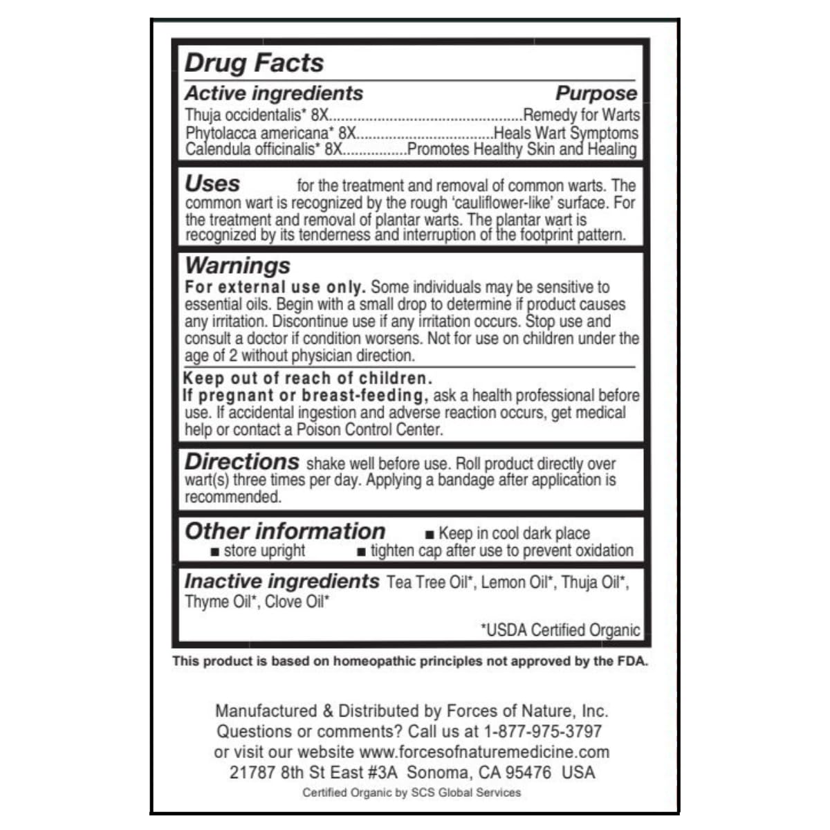Forces of Nature Wart Remover Extra Strength, Organic Homeopathic Medicine & Essential Oils for Wart Removal on Face, Body, Hands & Fingers, Plantar Wart Remover for Feet.Forces of Nature Wart Remover is a powerful and safe solution that helps remove warts without damaging the skin. This Extra Strength Wart Control painlessly removes warts on fingers, face, feet, and body, without scarring like freezing wart removers. The extra-strength formula is designed for tough wart strains and efficiently eliminates periungual, filiform, plantar, flat and body warts. Our dual-action formula is made with homeopathic medicines, and a combination of Tea Tree Oil, Lemon Oil, Thuja Oil, Thyme Oil and Clove essential oils to remove warts without leaving marks. The homeopathic medicine penetrates deep into the skin to remove warts on a cellular level. With regular use, warts will gradually fall off or fade and flake off, depending on the type of wart. Removal time will vary from person to person.At Forces of Nature, we pride ourselves on providing health care products that are not only cruelty-free, non-GMO and crafted with vegan- friendly ingredients, but also formulated for your family’s health and safety. Because we believe you deserve nothing but the best.