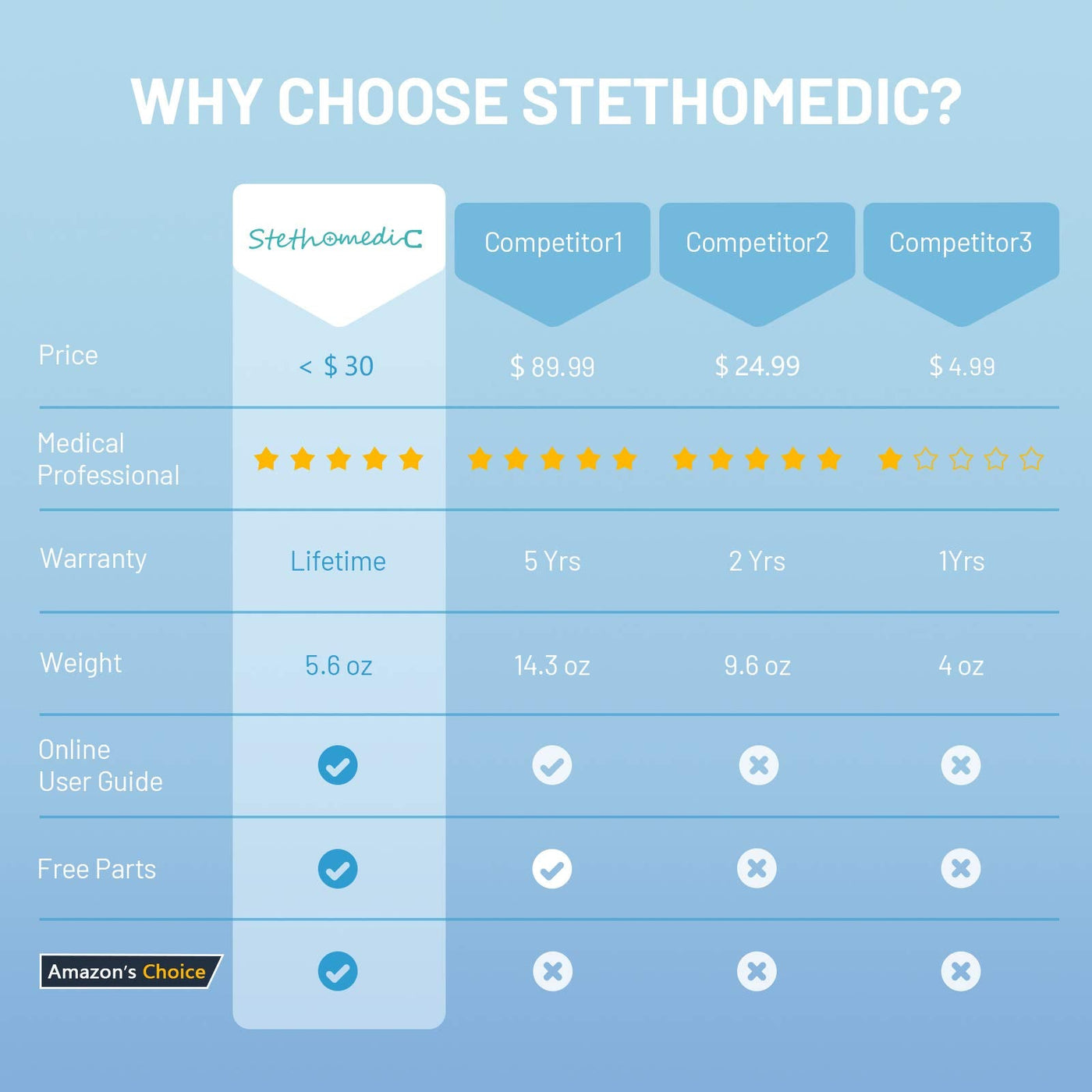 Read more About StethoMedic StethoMedic, a stethoscope brand by FriCARE, targets for providing essential and classic stethoscope for starters and for home use. Classic design and cost performance are the main features of this brand. StethoMedic Stethoscope Series - There is always one color that fits you. Stainless steel is considered as the best sound transmitter for stethoscope. The eartube and chestpiece for StethoMedic Stethoscope are made of this material. It only weighs 5.6 ounces and is even lighter than some aluminum ones. This is an ideal stethoscope for starters and home use. It would be overkill to purchase a costly one for blood pressure measurement, and burdens students as well. This stethoscope suits your needs and budget. It's an ideal gift for all kinds of occasions. Color: Navy Blue Length: 28 inch Weight: 5.6 oz Material: Stainless steel Includes: Extra diaphragms, eartips & name tag Read more Excellent Gift Perfect for gifts such as doctors, nurses, and veterinarians, the navy blue design is understated but distinctive. A Wide Range of Sound Double sided chestpiece performs better on capturing a wide range of sound. The bell is for low frequency, and diaphragm is for high frequency, which is easier to pick up S1 and S2, lung sounds, heart mumbles, carotid bruits, inside sounds, and most body sounds. Durable and Flexible Tubing No natural rubber latex is used on the tubing or any other parts. The tubing is less likely to pick up oils, stains and sweats, which can increase its lifespan. It won’t easily bend when placed in pocket or case either. Read more Tips: - If the bell is open, the diaphragm will be closed which can prevent sound coming in through the other side, and vice versa. - Indication dot on the stem should point towards the side to be used. Black Sphygmomanometer Navy Blue Sphygmomanometer Purple Sphygmomanometer Cuff Size 9-17 inch 9-17 inch 9-17 inch Natural Rubber Latex Not contain Not contain Not contain Free Parts Calibration Wrench Calibration Wrench Calibration Wrench Carry Case ✓ ✓ ✓ Stethoscope Not include Not include Not include Essential Stethoscope Lightweight Stethoscope Rose Gold Stethoscope Rose Gold Stethoscope Essential Stethoscope Repair Lifetime Lifetime Lifetime Lifetime Lifetime Tubing Color Navy Blue Matte Black White Black Chrome Yellow Weight 5.6 ounces 3.5 ounces 4.9 ounces 4.9 ounces 5.6 ounces Tubing Length 28 inches 28 inches 28 inches 28 inches 28 inches Free Parts Diaphragm, Eartips & Name Tag Diaphragm, Eartips & Name Tag Diaphragm, Eartips & Name Tag Diaphragm, Eartips & Name Tag Diaphragm, Eartips & Name Tag