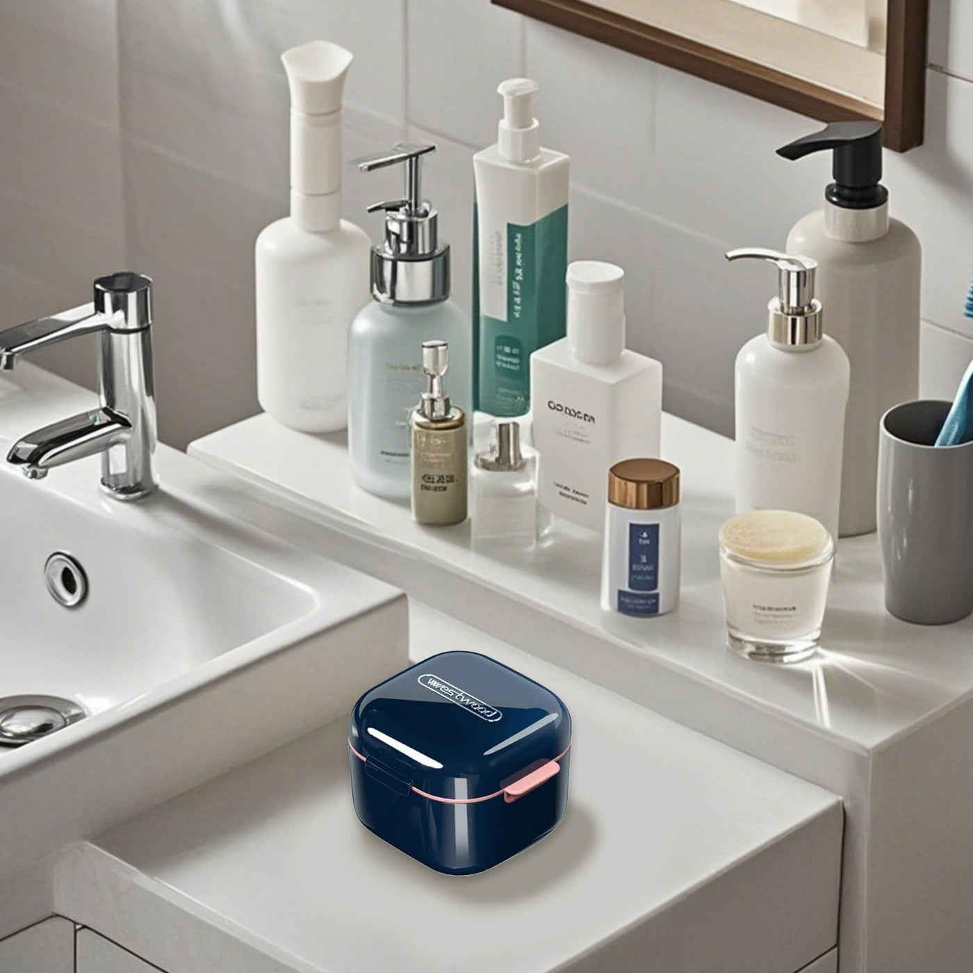Fsahiuf denture box with sieve, denture box, denture box retainer container, device that can be used as storage and washing for portable dentures, dentures (blue)