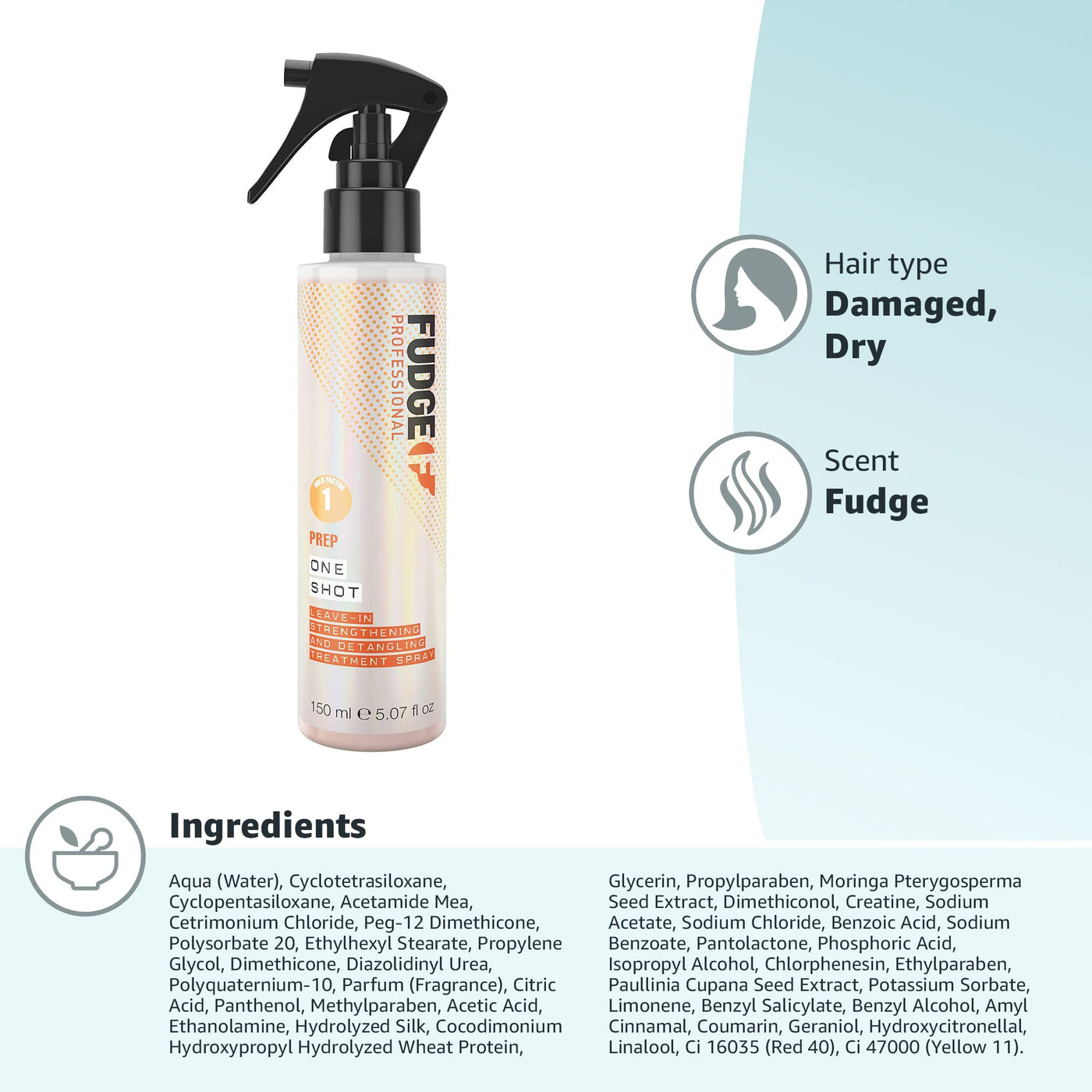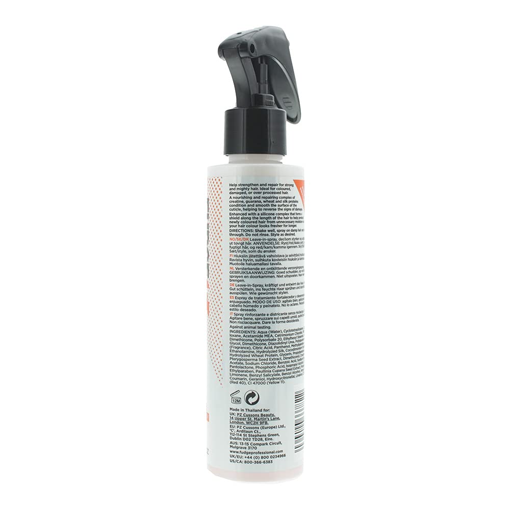 Fudge one shot, strengthening & detangling protein hair Treatment. Helps strengthen and repair for strong and mighty hair. Ideal for coloured, damaged, or over-processed hair. A nourishing and repairing complex of creatine, guarana, wheat and silk proteins condition and smooth the surface of the cuticle, helping to reverse the signs of damage. Enhanced with a silicone complex that forms a shield along the length of the hair to help protect newly-coloured hair from unnecessary moisture so your hair colour looks fresher for longer. Ingredients Aqua (Water), Cyclotetrasiloxane, Cyclopentasiloxane, Acetamide MEA, Cetrimonium Chloride, PEG-12 Dimethicone, Polysorbate 20, Ethylhexyl Stearate, Propylene Glycol, Dimethicone, Diazolidinyl Urea, Polyquaternium-10, Parfum (Fragrance), Citric Acid, Panthenol, Methylparaben, Acetic Acid, Ethanolamine, Hydrolyzed Silk, Cocodimonium Hydroxypropyl Hydrolyzed Wheat Protein, Glycerin, Propylparaben, Moringa Pterygosperma Seed Extract, Dimethiconol, Creatine, Sodium Acetate, Sodium Chloride, Benzoic Acid, Sodium Benzoate, Pantolactone, Phosphoric Acid, Isopropyl Alcohol, Chlorphenesin, Ethylparaben, Paullinia Cupana Seed Extract, Potassium Sorbate, limonene, Benzyl Salicylate, Benzyl Alcohol, Amyl Cinnamal, Coumarin, Geraniol, Hydroxycitronellal, linalool, CI 16035 (Red 40), CI 47000 (Yellow 11)