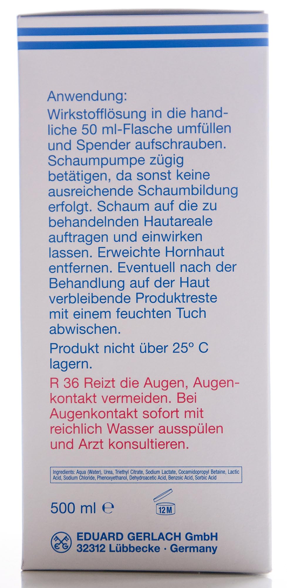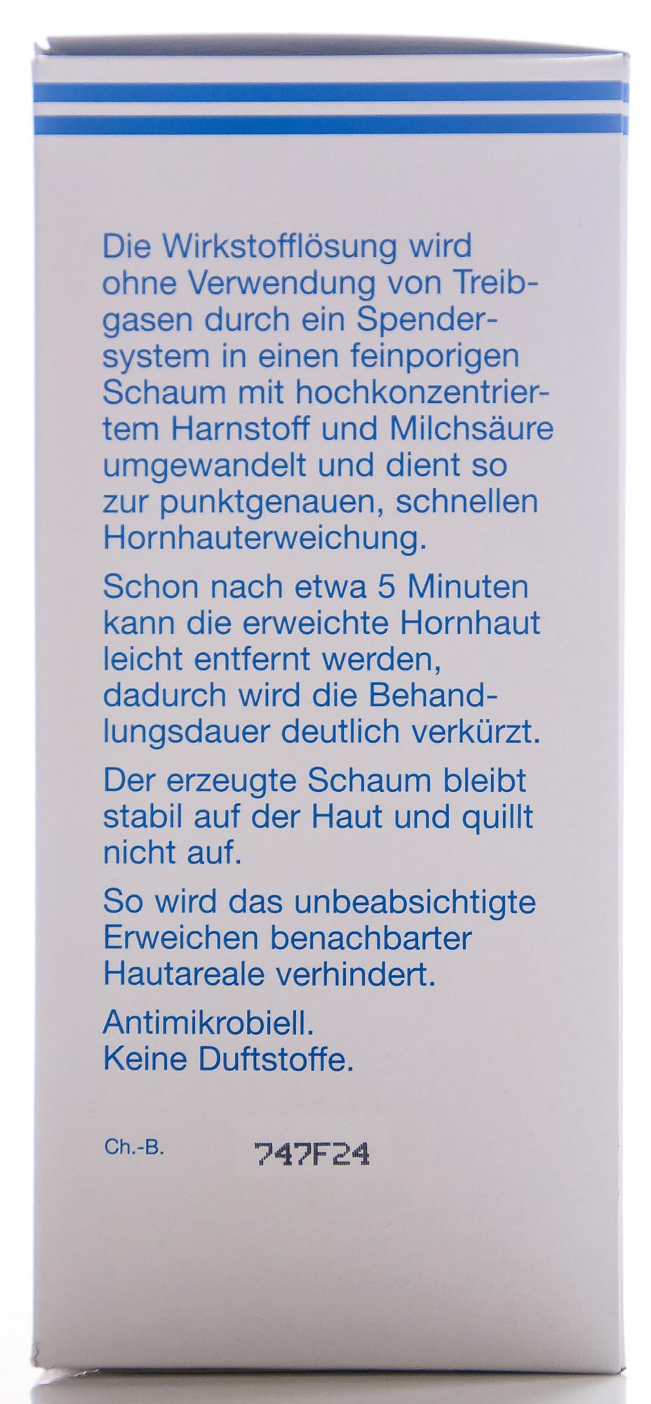 Product descriptions The active ingredient solution is produced without the use of propellant gases through a dispenser system in a fine-pored foam with highly concentrated Urea and lactic acid are converted and are thus used for precise, rapid Corneal softening. After about 5 minutes, the softened callus can be easily removed. This significantly shortens the treatment time. The foam produced remains stable on the skin and does not swell. That's how it will be prevents the unintentional softening of neighboring skin areas. Application Pour the active ingredient solution into the handy 50 ml bottle and dispenser screw on. Operate the foam pump quickly, otherwise there will not be enough foam Foam formation occurs. Apply foam to the skin areas to be treated and let absorb. Remove softened calluses. Possibly after the treatment Wipe off any product residue remaining on the skin with a damp cloth. Do not store product above 25°C. Ingredients / Ingredients AQUA (WATER), UREA, TRIETHYL CITRATE, SODIUM LACTATE, COCAMIDOPROPYL BETAINE, LACTIC ACID, SODIUM CHLORIDES, PHENOXYETHANOL, DEHYDROACETIC ACID, BENZOIC ACID, SORBIC ACID P.when('A').execute(function(A) { A.on('a:expander:toggle_description:toggle:collapse', function(data) { window.scroll(0, data.expander.$expander[0].offsetTop-100); }); }); Instructions for use To soften the calluses, add active ingredient solution handy 50 ml bottle and screw on the dispenser. Press Foam pump quickly to create a fine-pored foam. Wear on treating Areas of skin allow it to take effect. After about 5 minutes, softened can be removed become. Any product residue can then be wiped off with a damp cloth Do not store the product above 25°C. More