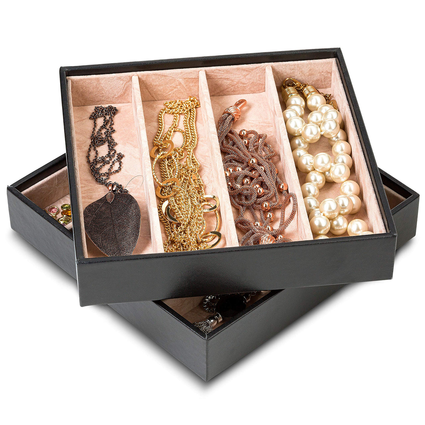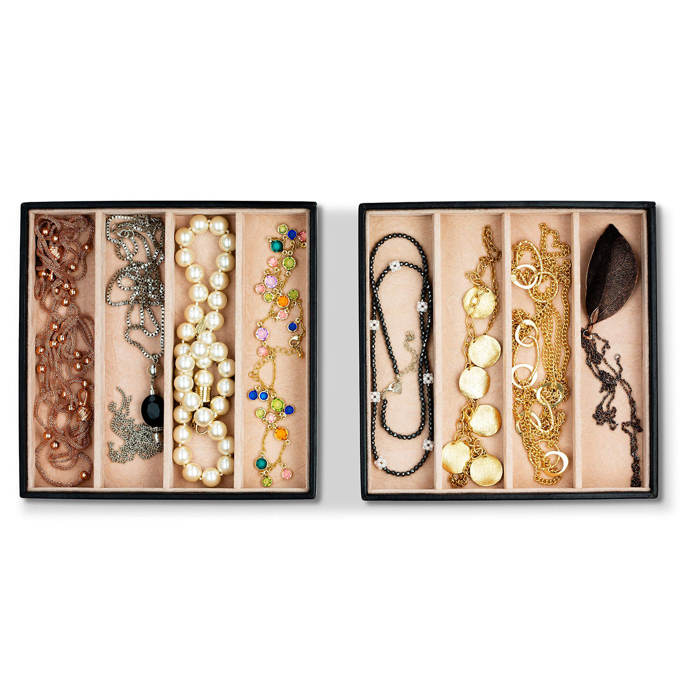 - 8 RECTANGULAR COMPARTMENTS - These trays each have 4 rectangular compartments , ( with a total of 8 ) to keep your jewelry separate, organized and neatly displayed. The compartments hold most necklaces, bracelets and chains, etc. This set includes 2 trays with 4 slots each.